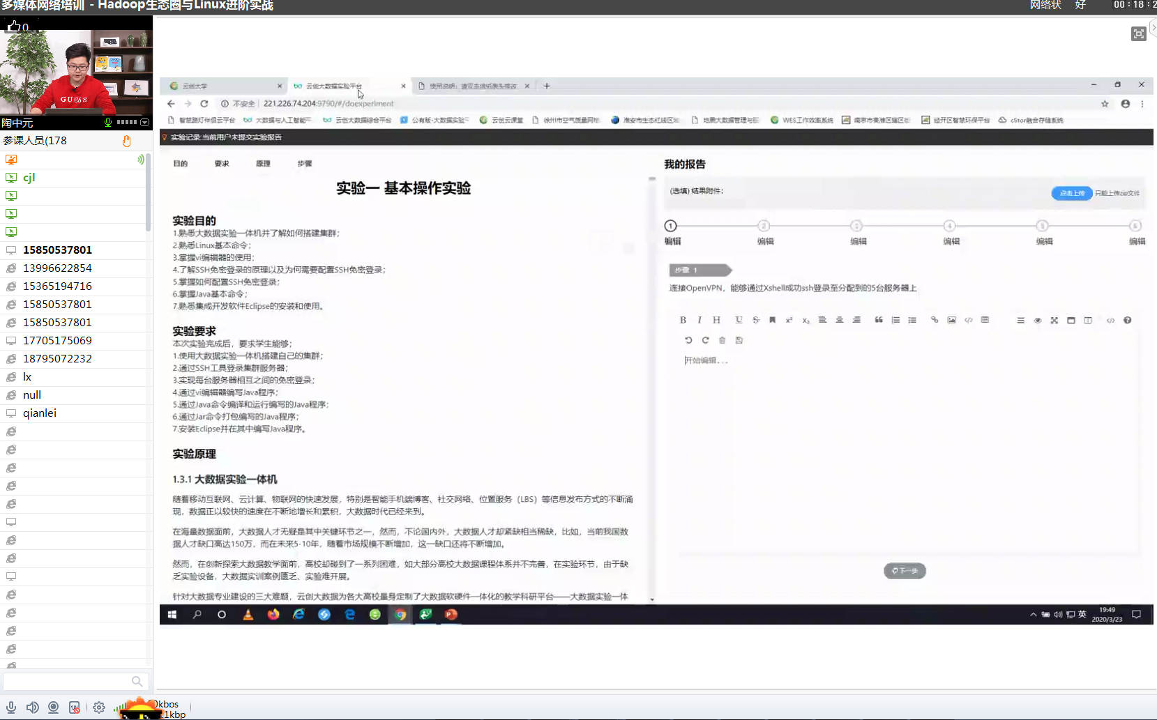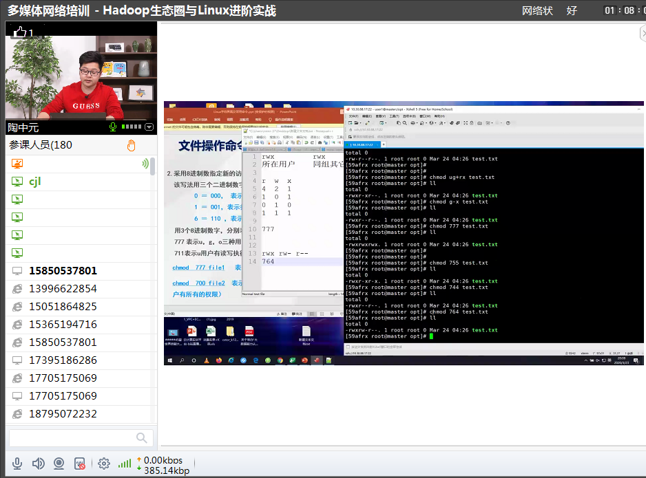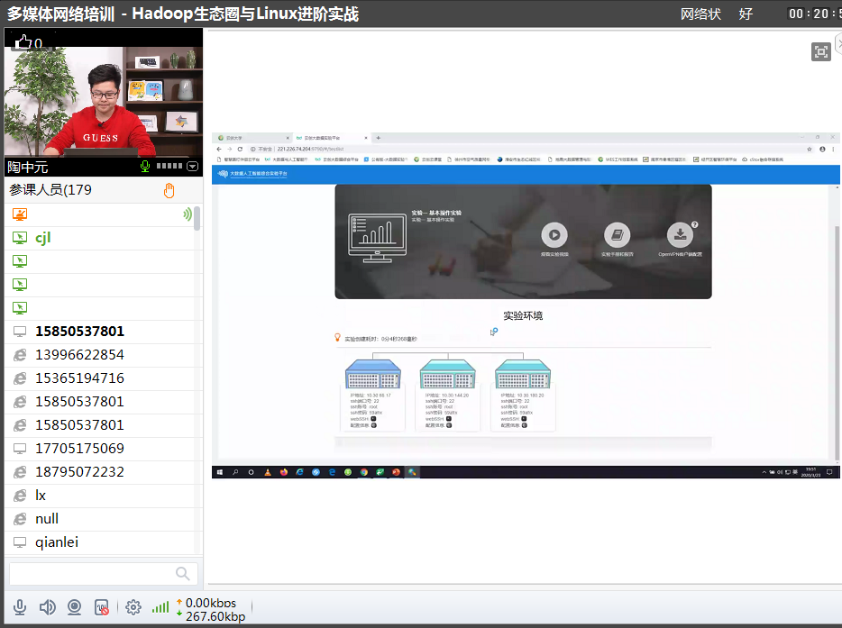 在當天的課程中,云創大數據優秀講師(工程師)陶中元帶來了第一課“Hadoop生態圈與Linux進階實戰”的課程講解。陶中元講師從基礎的理論知識講起,再到實戰操作,一步步帶大家完成了學習和實驗。大家對陶中元講師詳盡細致的知識講解和認真負責的授課態度給予不俗評價。同時,云創開發工程師組成的助教團隊也守候在彈幕區,替大家解決遇到的各種疑難問題。