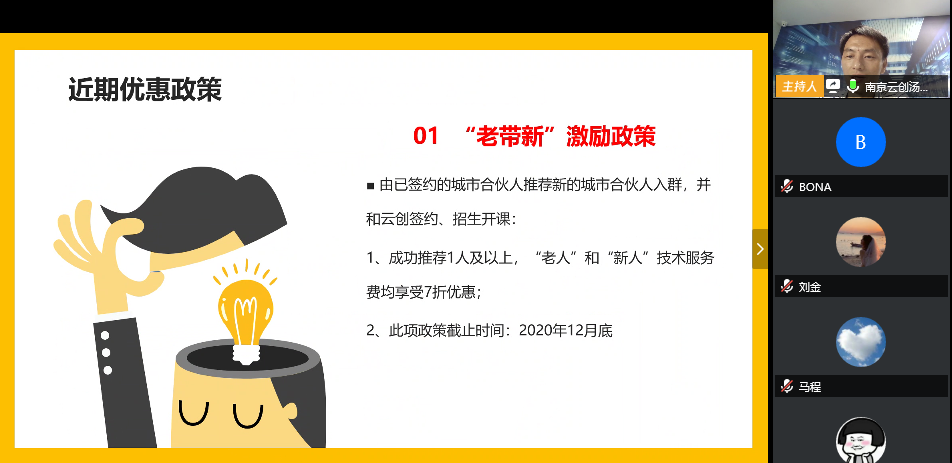 為了進一步拓展合作規模,使更多合伙人能夠在全國各個城市推進云創青少年人工智能學院成熟的商業模式,9月22日下午,云創大數據在騰訊會議線上舉辦了云創青少年人工智能學院城市合伙人大會,現有城市合伙人和有意向成為城市合伙人的行業同仁蒞臨參會。