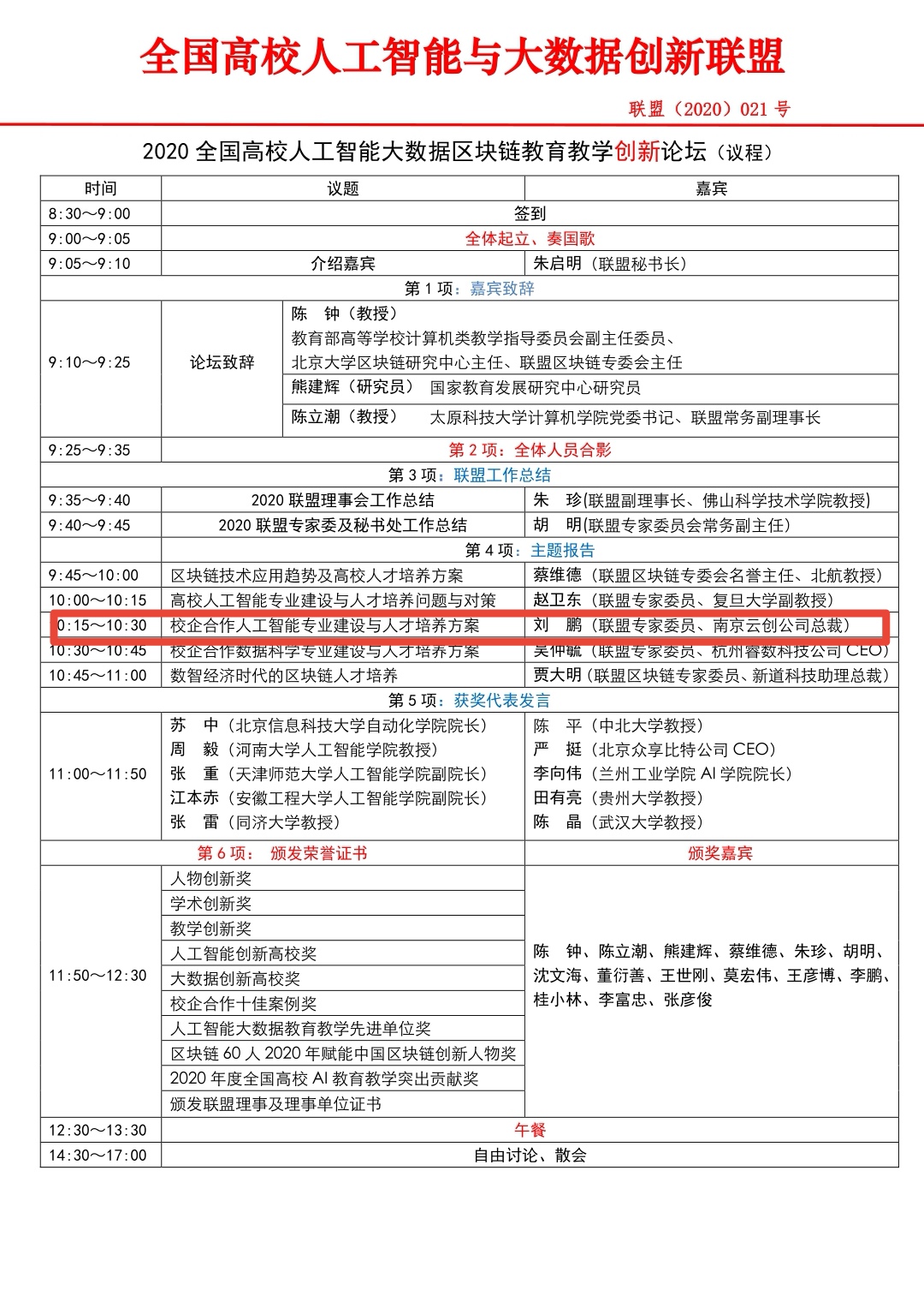 其中,清華大學(xué)博士、中國大數(shù)據(jù)應(yīng)用聯(lián)盟人工智能專家委員會主任、中國信息協(xié)會教育分會人工智能教育專家委員會主任、云創(chuàng)大數(shù)據(jù)總裁劉鵬教授同樣受邀參會,并在主題報告環(huán)節(jié)作了題為“校企合作人工智能專業(yè)建設(shè)與人才培養(yǎng)方案”的精彩發(fā)言。
