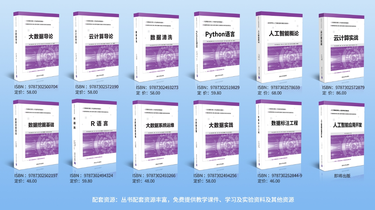 具體而言,叢書包含《人工智能概論》、《云計算導論》、《云計算實戰》、《大數據導論》、《數據清洗》、《Python語言》、《數據挖掘基礎》、《R語言》、《大數據系統運維》、《大數據實踐》、《數據標注工程》、《人工智能應用開發》。該叢書內容側重于實踐應用,不僅對知識點給出具體的操作步驟,而且有配套的動手實驗。內容安排遵循從簡單到復雜、從理論到實踐的學習過程,同時也遵循系統性和覆蓋面寬的原則。