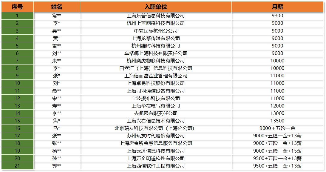 通過云創的培訓,某民辦三本院校畢業生起薪平均超過10000元。以下為其部分學生就業單位和月薪: