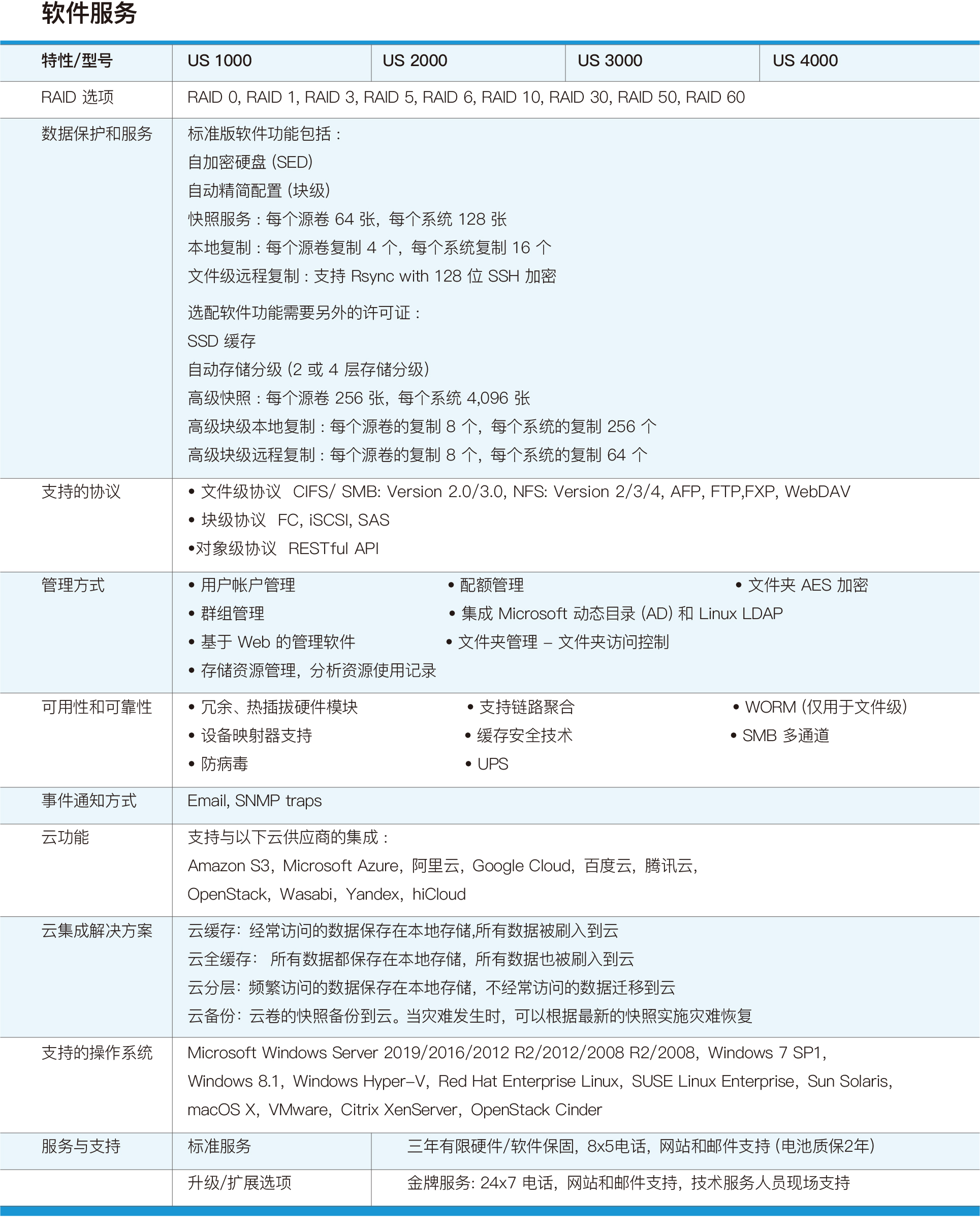 rStor US系列是專為企業(yè)設(shè)計的高可用性解決方案,集成了 SAN 和 NAS 服務以及云網(wǎng)關(guān)于一體的統(tǒng)一存儲產(chǎn)品,具有高效穩(wěn)定的性能、可靠模塊化設(shè)計、靈活主機板選擇、完善的數(shù)據(jù)服務、高擴展性等特點。廣泛應用于數(shù)據(jù)庫、虛擬化、視頻編輯、文件共享、備份、監(jiān)控和云數(shù)據(jù)集成等場景。