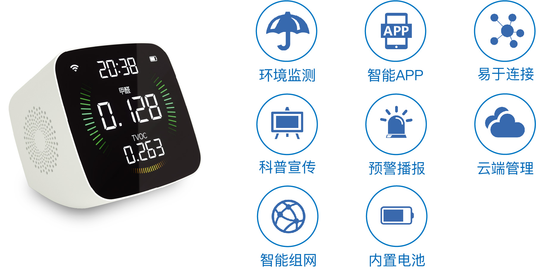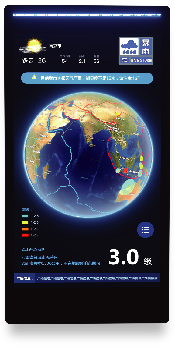 集成了地震預警、氣象預警、防洪防汛預警、地質災害預警以及地震烈度速報的應急信息發布終端。通過紅、橙、黃、藍四色燈光及聲音進行應急預警,并通過內置三軸加速度傳感器記錄震時震感數據、內置高清攝像頭采集地震現場災情。還能通過設備位置、人臉識別實現定點精確推送,提供內容發布、新聞推送、交通實況、生活指數等諸多智慧服務功能。