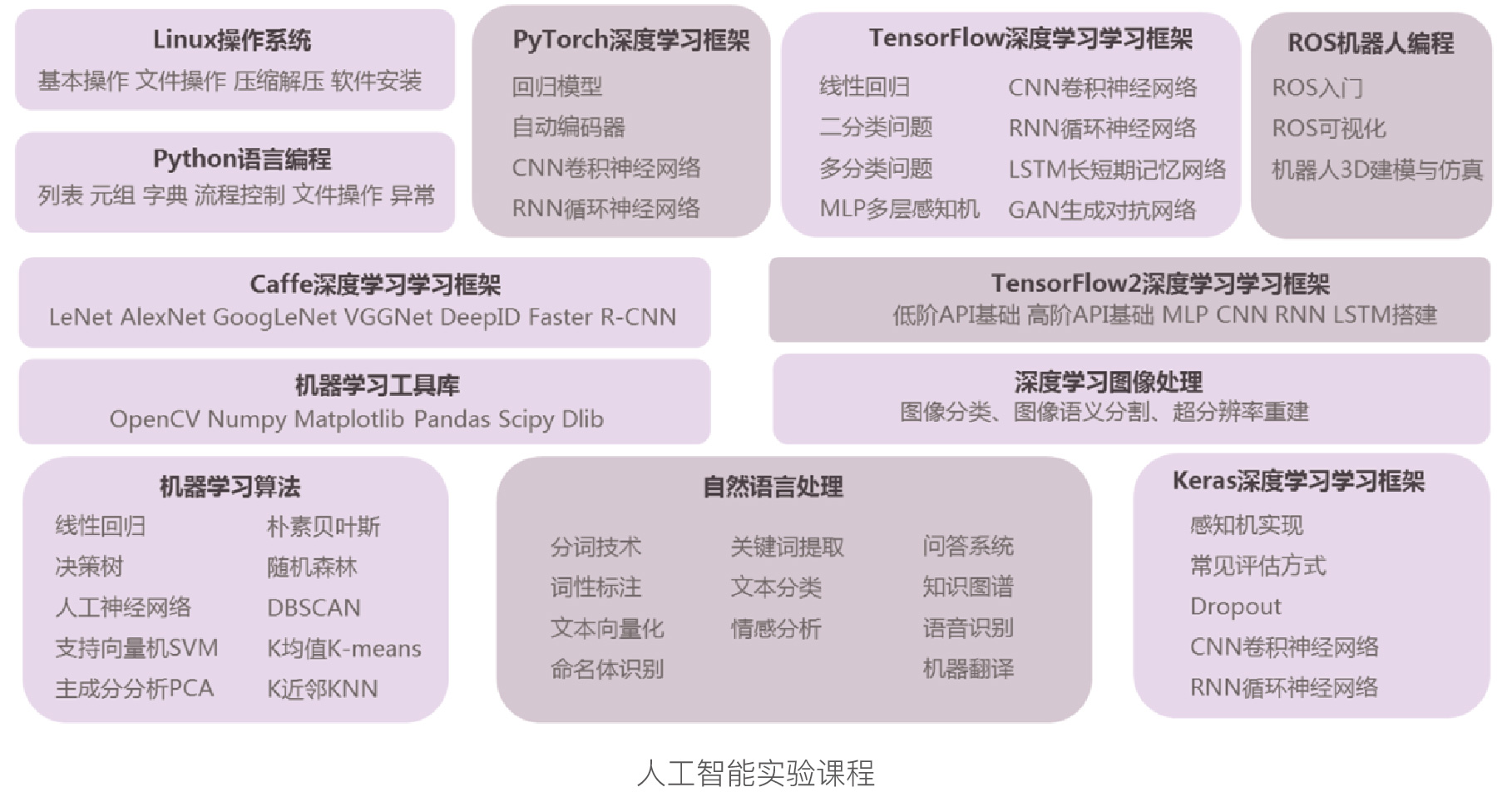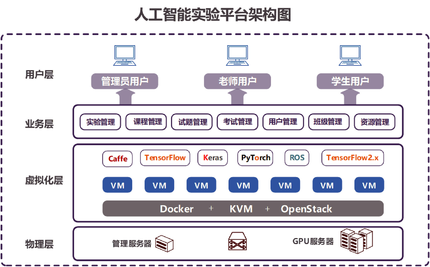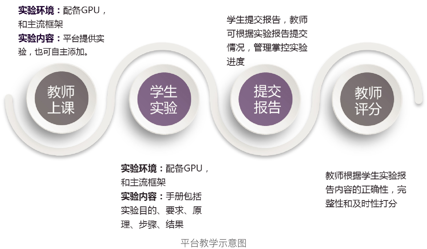 平臺(tái)通過(guò)云計(jì)算技術(shù)對(duì)計(jì)算、存儲(chǔ)、網(wǎng)絡(luò)和加速卡等資源進(jìn)行統(tǒng)一的管理和調(diào)度,支持虛擬機(jī),支持私有化部署,支持課程、實(shí)驗(yàn)、用戶(hù)、資源等管理功能。通過(guò)平臺(tái),老師可以一鍵搭建實(shí)驗(yàn)環(huán)境,在線跟蹤學(xué)生實(shí)驗(yàn)進(jìn)展,并進(jìn)行在線學(xué)習(xí)診斷。學(xué)生可以直接通過(guò)瀏覽器訪問(wèn)平臺(tái),根據(jù)指南在線做實(shí)驗(yàn)、寫(xiě)報(bào)告,無(wú)需配置繁瑣的本地環(huán)境。結(jié)合人工智能產(chǎn)業(yè)趨勢(shì)、崗位模型、企業(yè)人才需求,設(shè)置了以AI基礎(chǔ)以及應(yīng)用的課程體系,并全面支撐計(jì)算機(jī)、人工智能、機(jī)器人、自動(dòng)化以及區(qū)塊鏈等專(zhuān)業(yè)建設(shè)。
