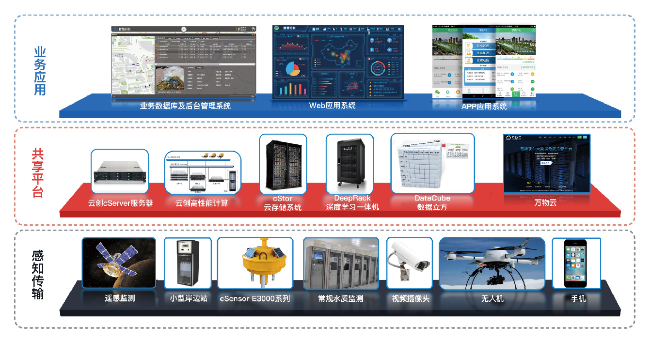 ‘智慧河長” 總體設計分為三層架構:感知傳輸層、共享平臺層和業務應用層:
