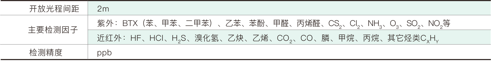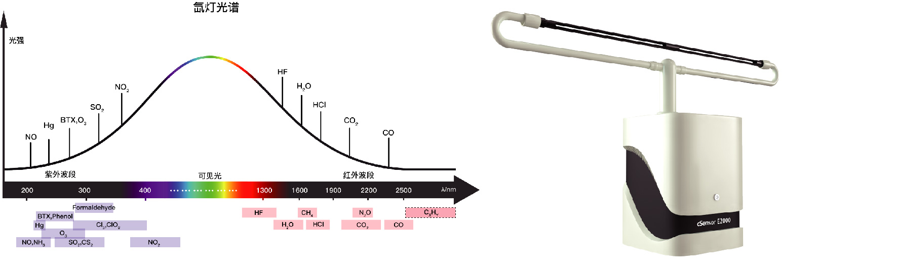 cSensor E2100系列氣體光譜分析儀在被監測區域的兩端,分別放置一個光“發射器和一個光“接收器”。在監測時,從“發射器”的氙燈發射出具有穩定光譜的光束,由“接收器”接收后通過光纖傳輸到光纖光譜儀中,光譜儀內的移動光柵會將整個光波切分為若干條譜帶。由于監測區域內的各種氣態物質對光的能量會產生特征吸收,可以在相應的譜帶中尋找到待測氣體物質的特征吸收譜線。該分析儀遵循Beer-Lambert定律,通過測量光吸收強度可以計算出來該氣體濃度。
