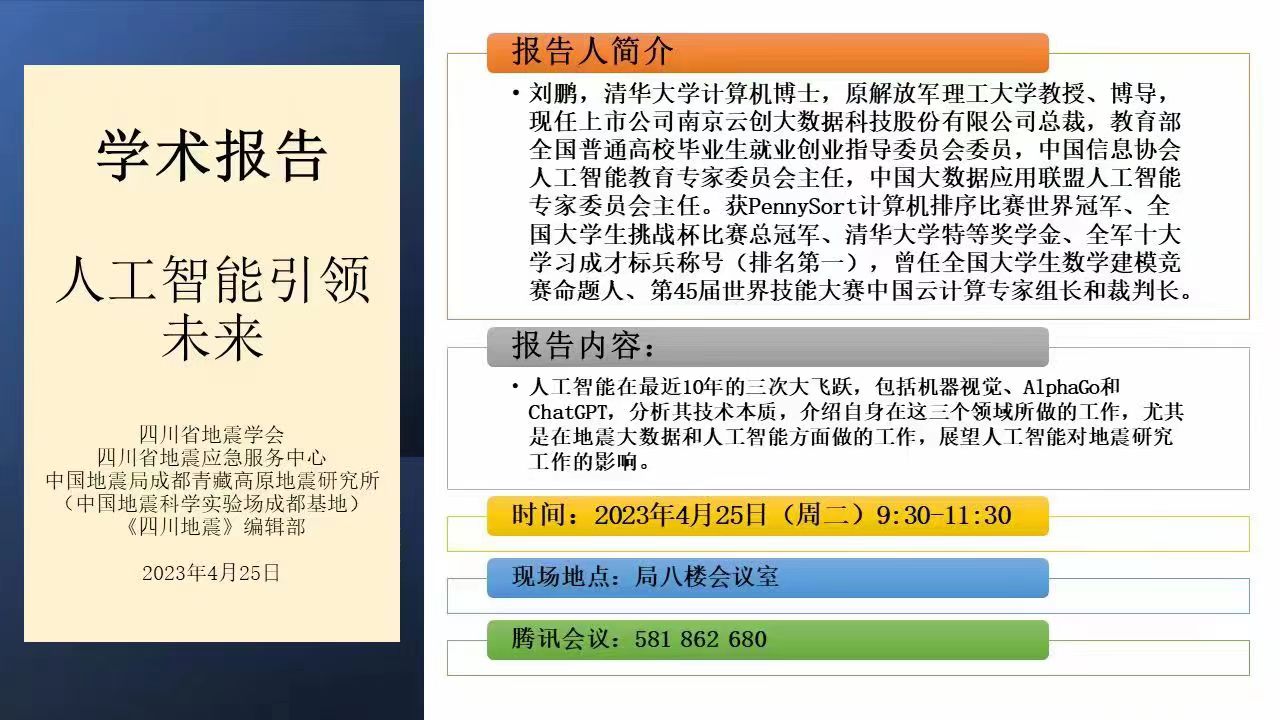 4月25日上午,四川省地震學會、四川省地震應急服務中心、中國地震局成都青藏高原地震研究所(中國地震科學實驗場成都基地)、《四川地震》編輯部聯合舉辦學術報告會,劉鵬教授受邀作主題報告。本次報告還通過騰訊會議的形式組織進行。
