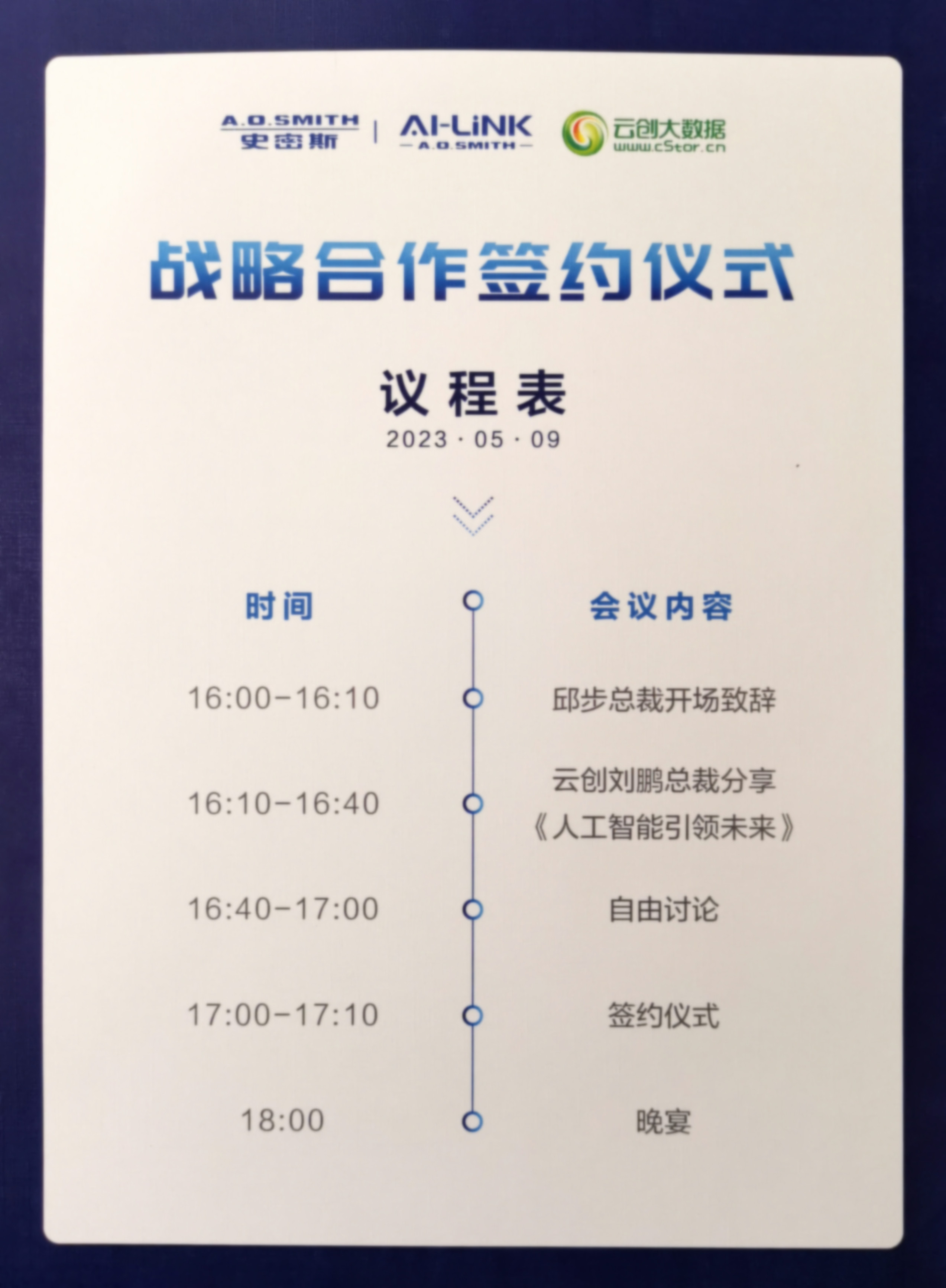 在簽約之前,邱步總裁表達了A.O.史密斯對技術的篤信,明確了雙方品牌理念和業務領域的契合,劉鵬總裁表達了云創大數據對創新的堅守,分享了近期人工智能技術的創新發展。對于行業發展動向以及未來合作事宜,雙方表示深度認同,并針對具體業務場景深入探討了合作細節。在簽約儀式上,邱步總裁與劉鵬總裁代表雙方簽署了戰略合作協議。