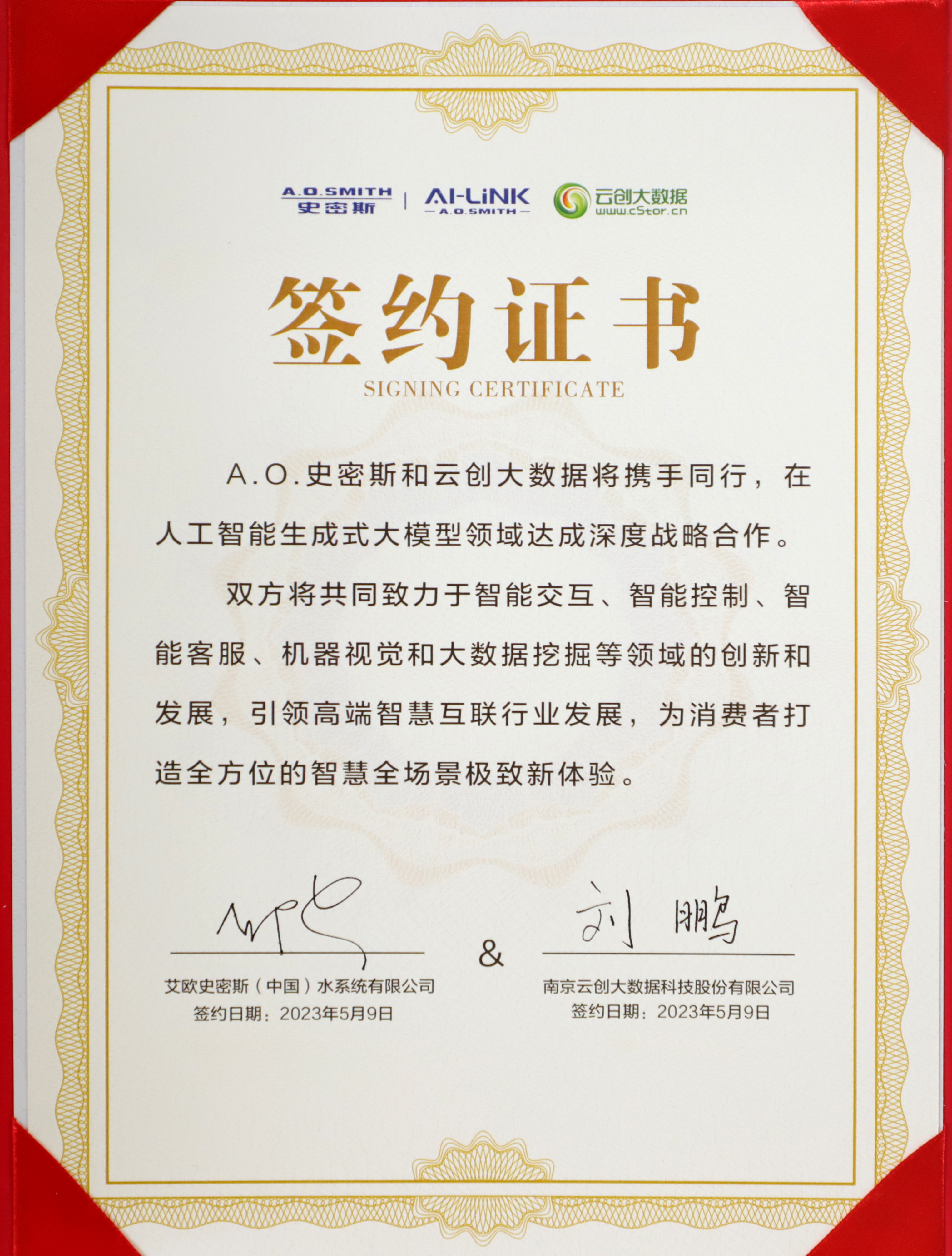 自協議簽署之后,云創大數據和A.O.史密斯將攜手同行,在人工智能生成式大模型領域建立深度戰略合作。具體而言,雙方將共同致力于在智能交互、智能控制、智能客服、機器視覺和大數據挖掘等領域開展戰略合作,以創新引領高端智慧互聯行業發展,為客戶打造智慧全場景的新體驗。
