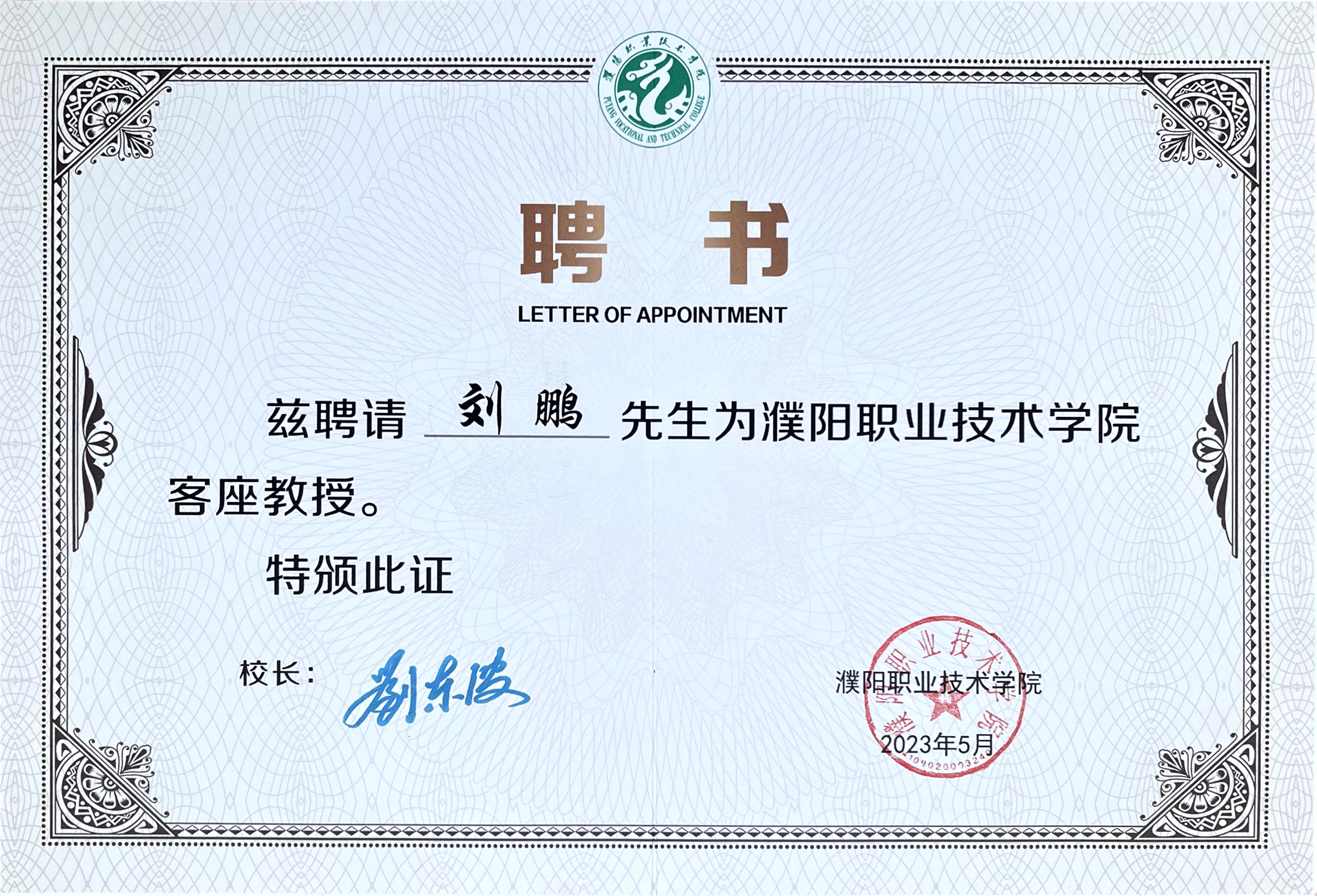 值得一提的是,劉鵬教授憑借在計算機(jī)教育領(lǐng)域的學(xué)術(shù)造詣和出色成就,受聘為濮陽職業(yè)技術(shù)學(xué)院客座教授。