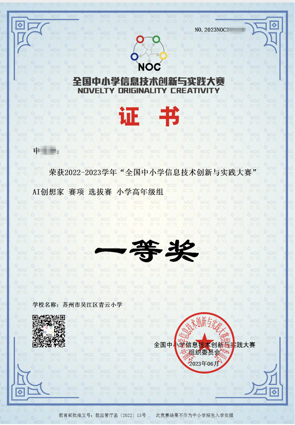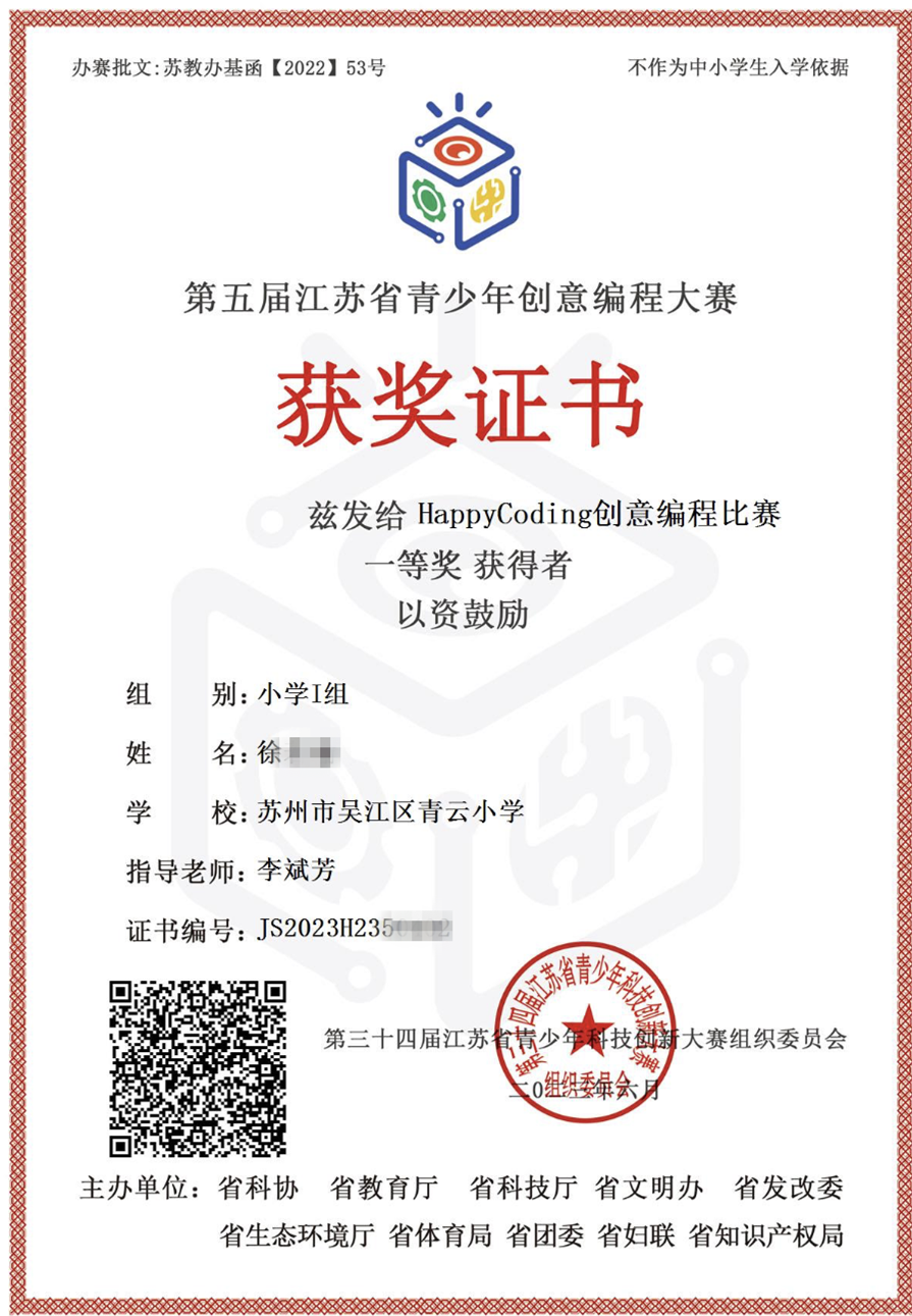 此前,該校還有學生取得2022-2023學年“全國中小學信息技術創新與實踐大賽”AI創想家賽項選拔賽小學高年級組一等獎,與第五屆江蘇省青少年創意編程大賽HappyCoding創意編程比賽小學Ⅰ組一等獎的優異成績。
