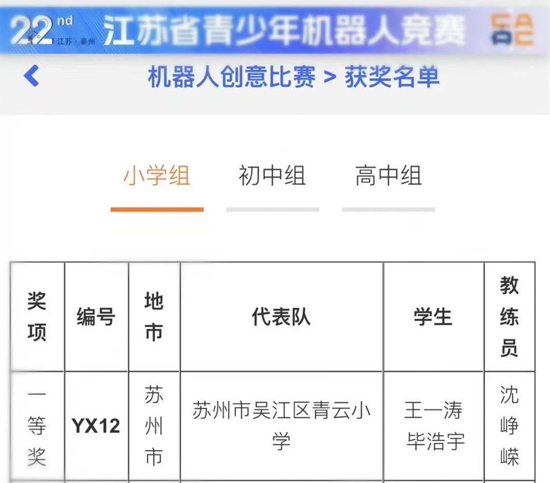 在本屆比賽中,來自蘇州市吳江區青云小學的兩位學生勇奪機器人創意比賽小學組一等獎的佳績。青云小學代表隊也成為江蘇省唯一進入國賽的代表隊。