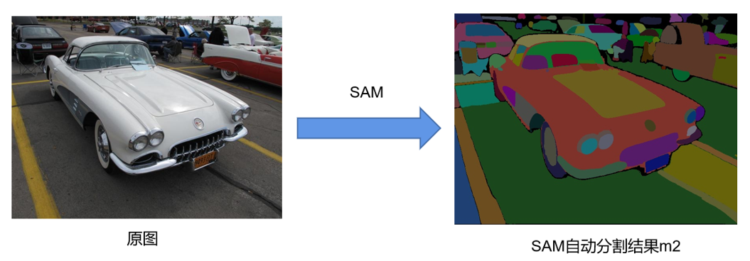 如前所述, SAM的自動分割不返回標簽信息,并且一個實例(例如,一輛車)可能會被拆分成多個小區域。
