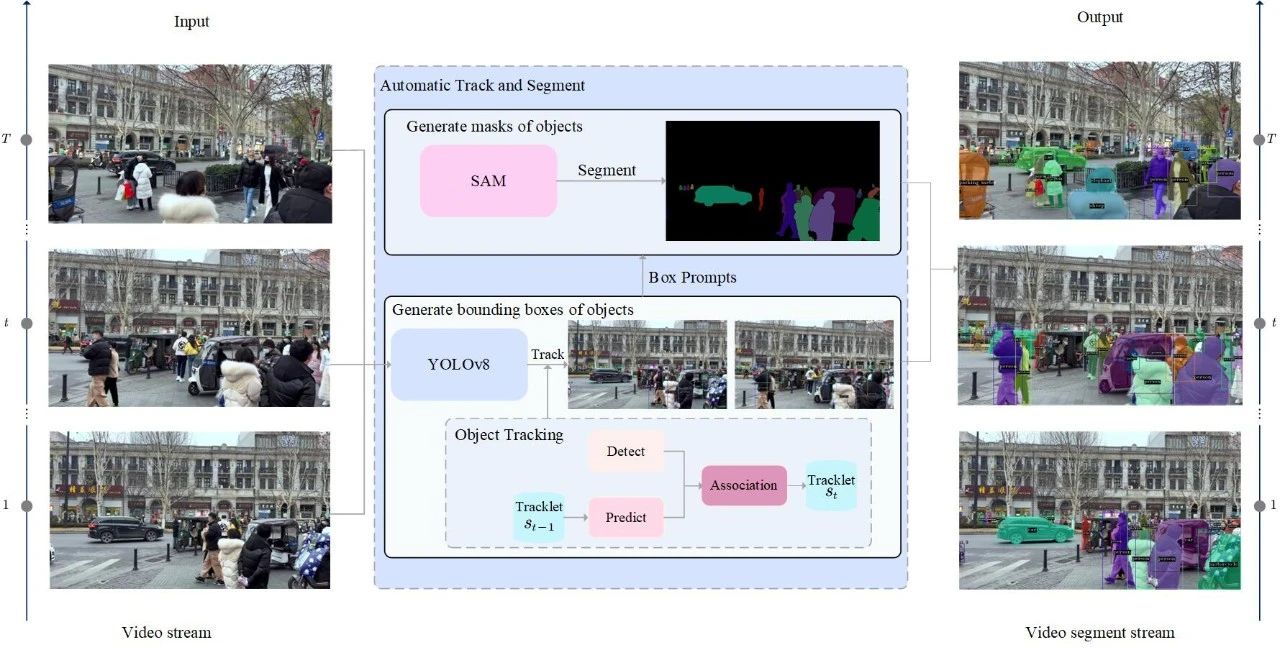 該方法同樣可用于視頻分割任務,與處理單幅圖像不同的是,除了分割,我們通常更關心目標的運動軌跡、目標重識別,以及如何實現一鍵摳視頻等。因此研發團隊在SAM和YOLOv8的基礎上加入跟蹤算法,持續關注感興趣的目標,這樣比單純地分割每幀圖像更有實際意義。