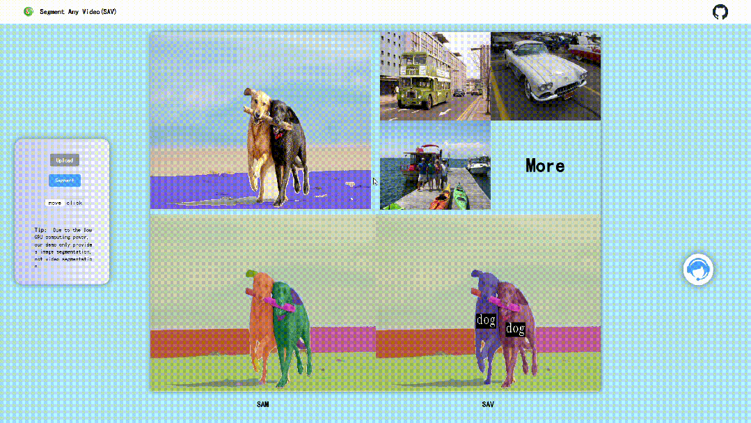 在首頁可任意選擇一張示例圖片,也可從本地上傳圖片,然后點擊Segment按鈕,就可以同時得到SAM和SAV的結果。
