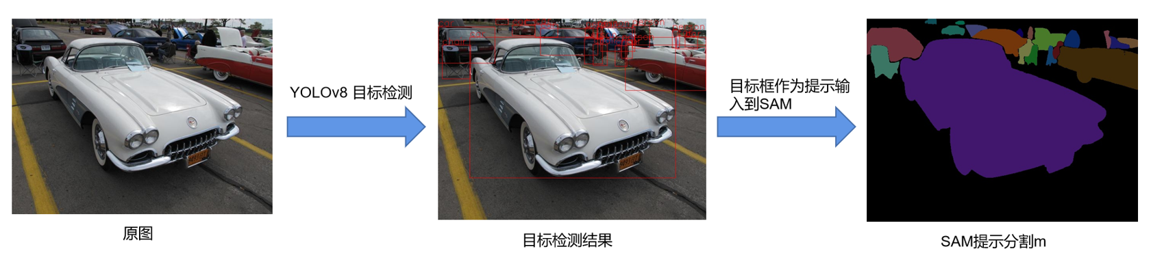 基于此,研發團隊在SAM的基礎上加入YOLOv8檢測模型,YOLOv8返回的結果中包含目標框、類別及置信度,目標框可作為提示信息輸入到SAM,類別名稱即為標簽,因此SAM加YOLOv8可有效地解決上述問題。