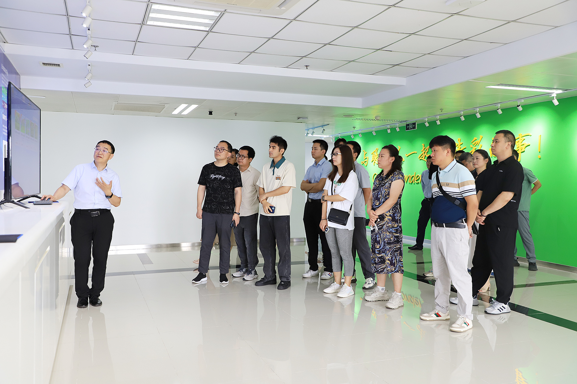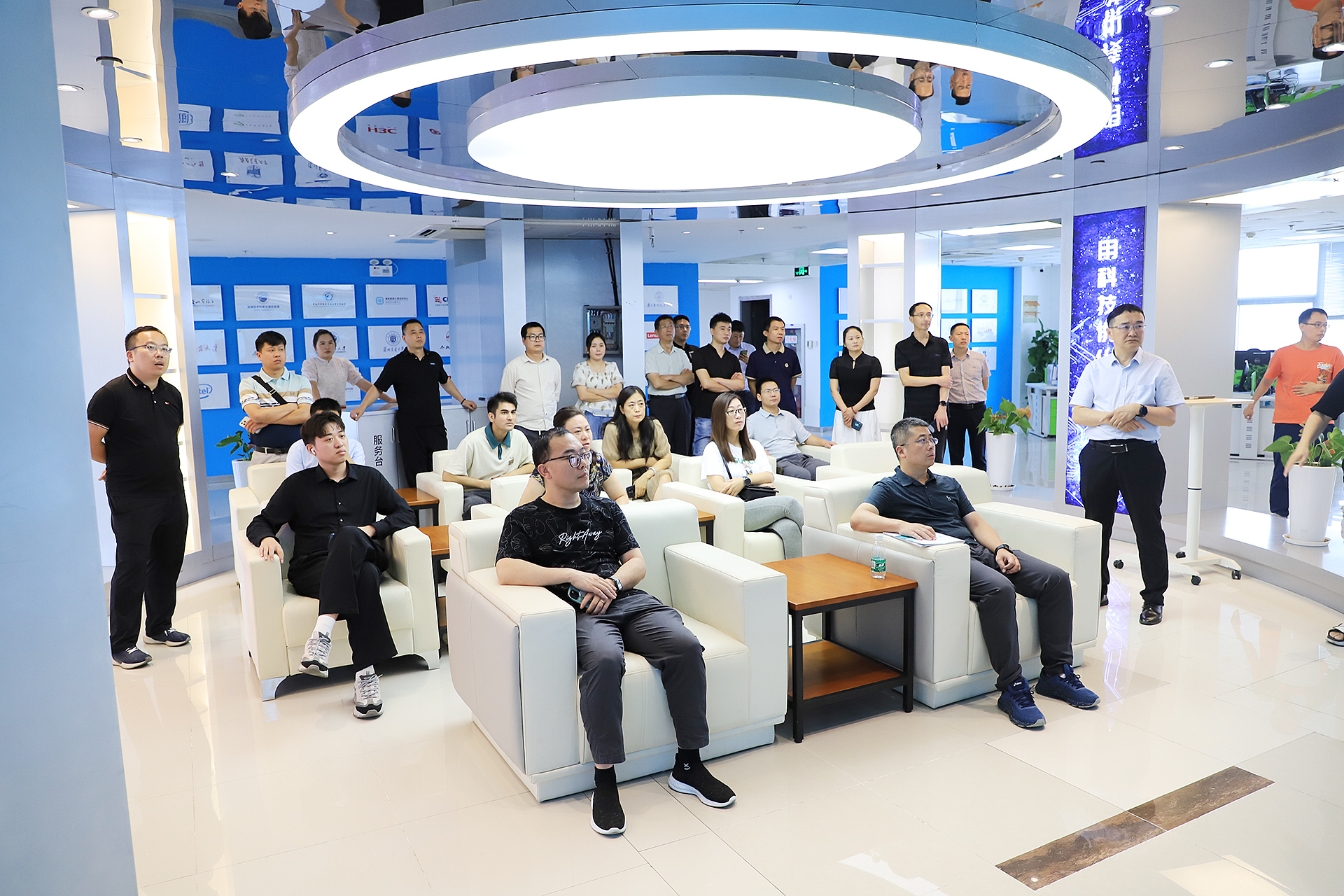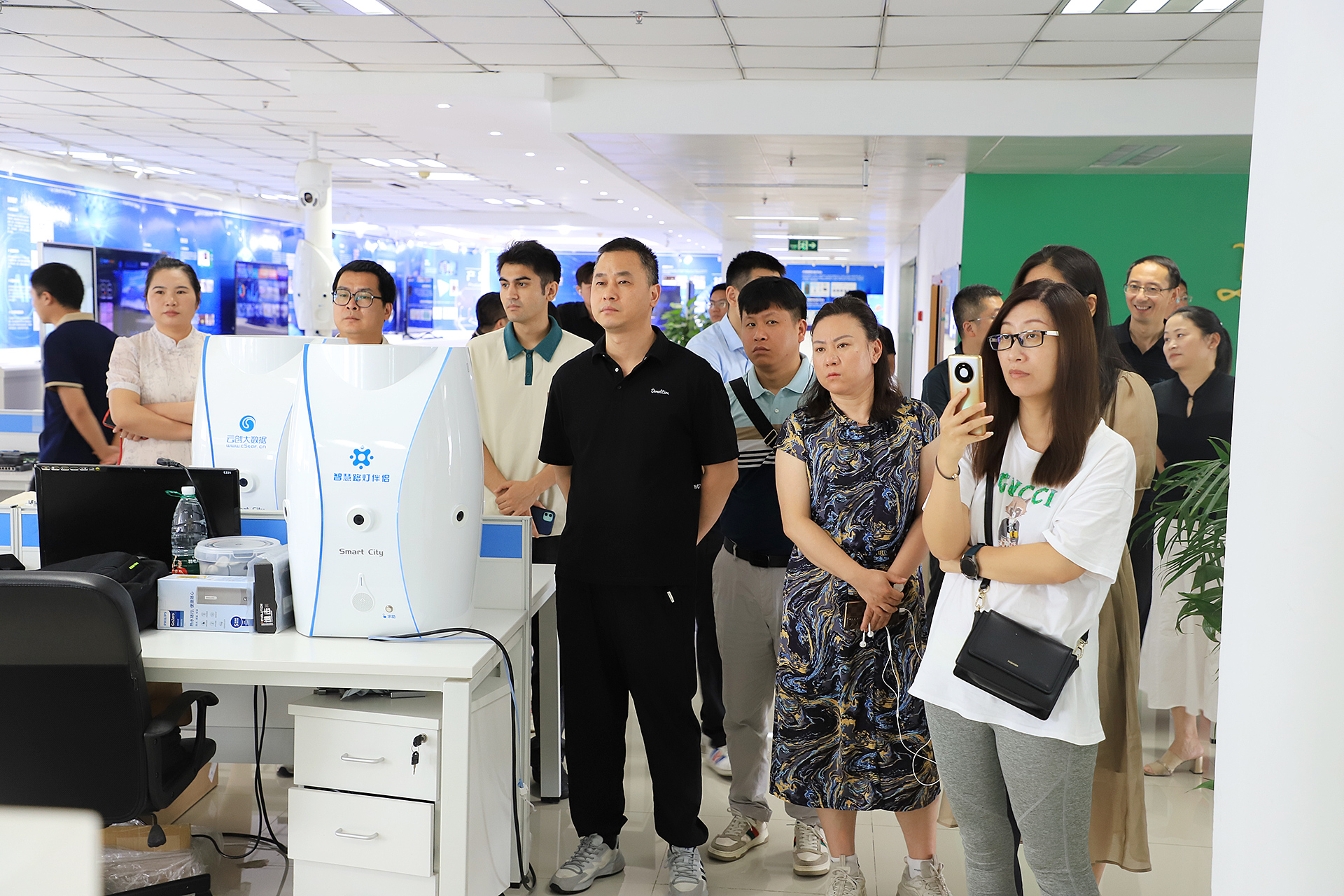 接著,大家對云創大數據進行了實地參觀。在中國云計算創新基地A棟10層、9層、8層,劉鵬教授帶大家逐一進行參觀。多處展示的產品應用、榮譽資質、技術專利等得到了大家的不俗評價。大家時不時針對感興趣的話題,與劉鵬教授進行交流。