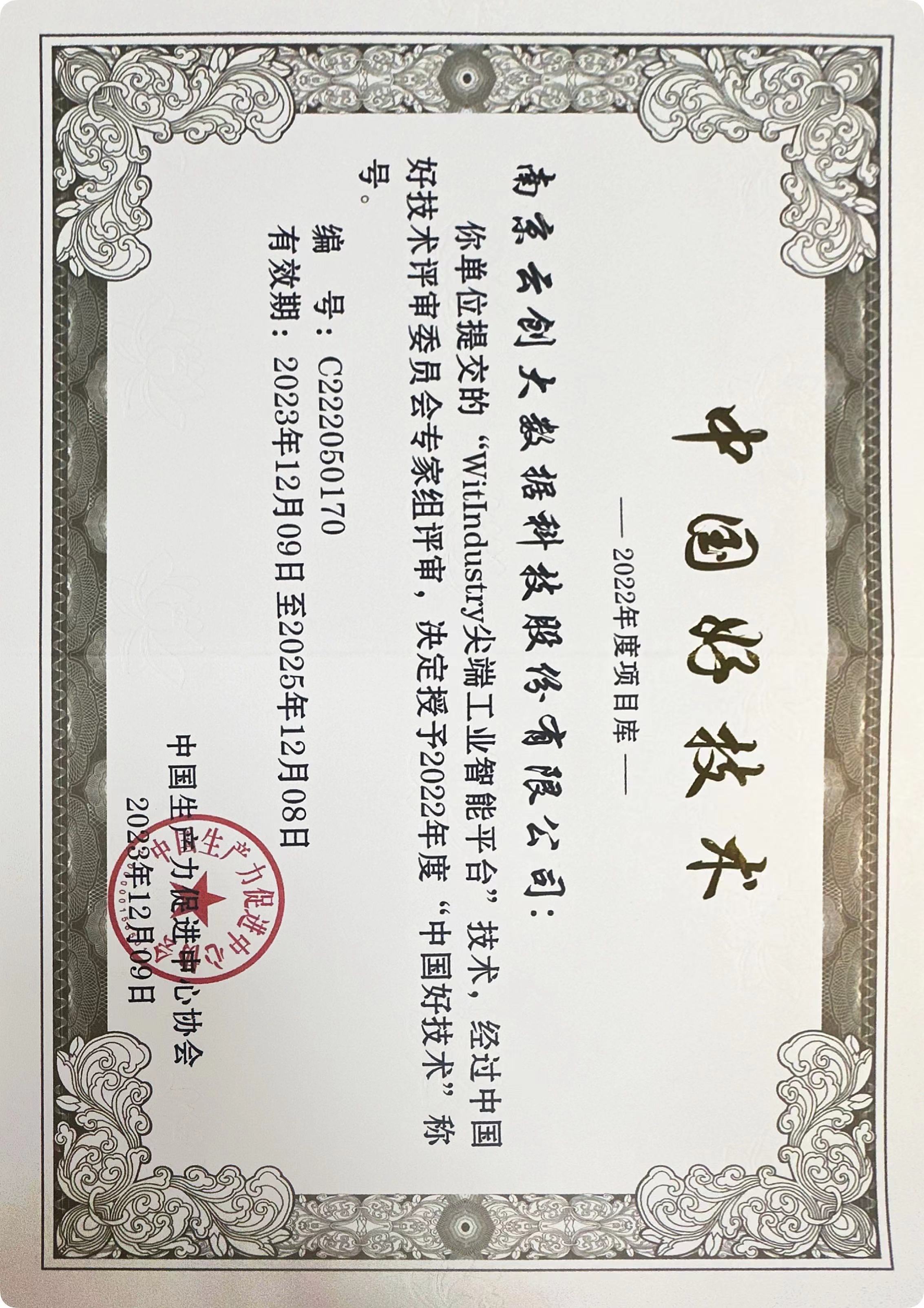 近日,經“中國好技術” 評審委員會評審,“中國好技術”管理委員會審核,云創大數據“WitIndustry 尖端工業智能平臺”技術被授予2022年度“中國好技術”稱號。此次獲獎也是“WitIndustry 尖端工業智能平臺”收獲的第三項榮譽。