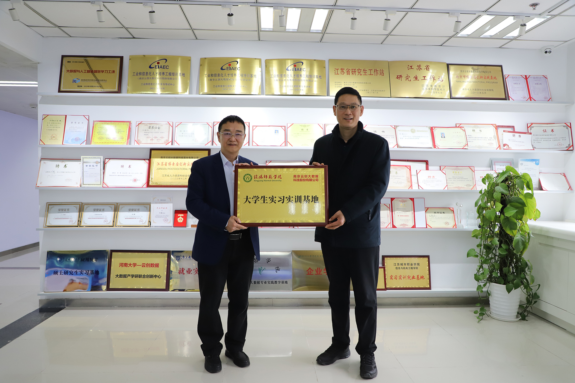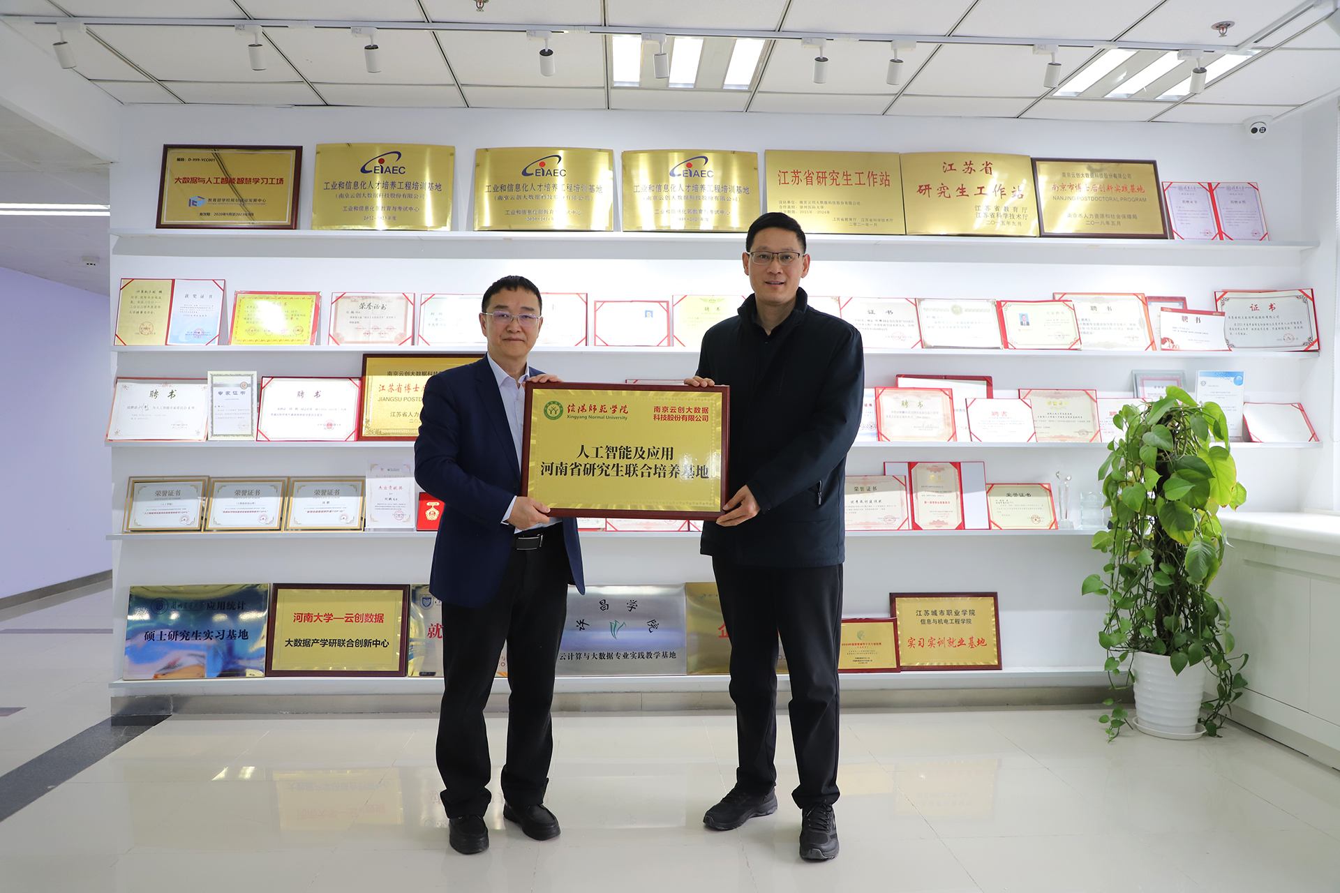 在揭牌環節,劉鵬教授與馮巖院長共同為信陽師范大學-云創大數據“大學生實習實訓基地”、“人工智能及應用河南省研究生聯合培養基地”進行揭牌。