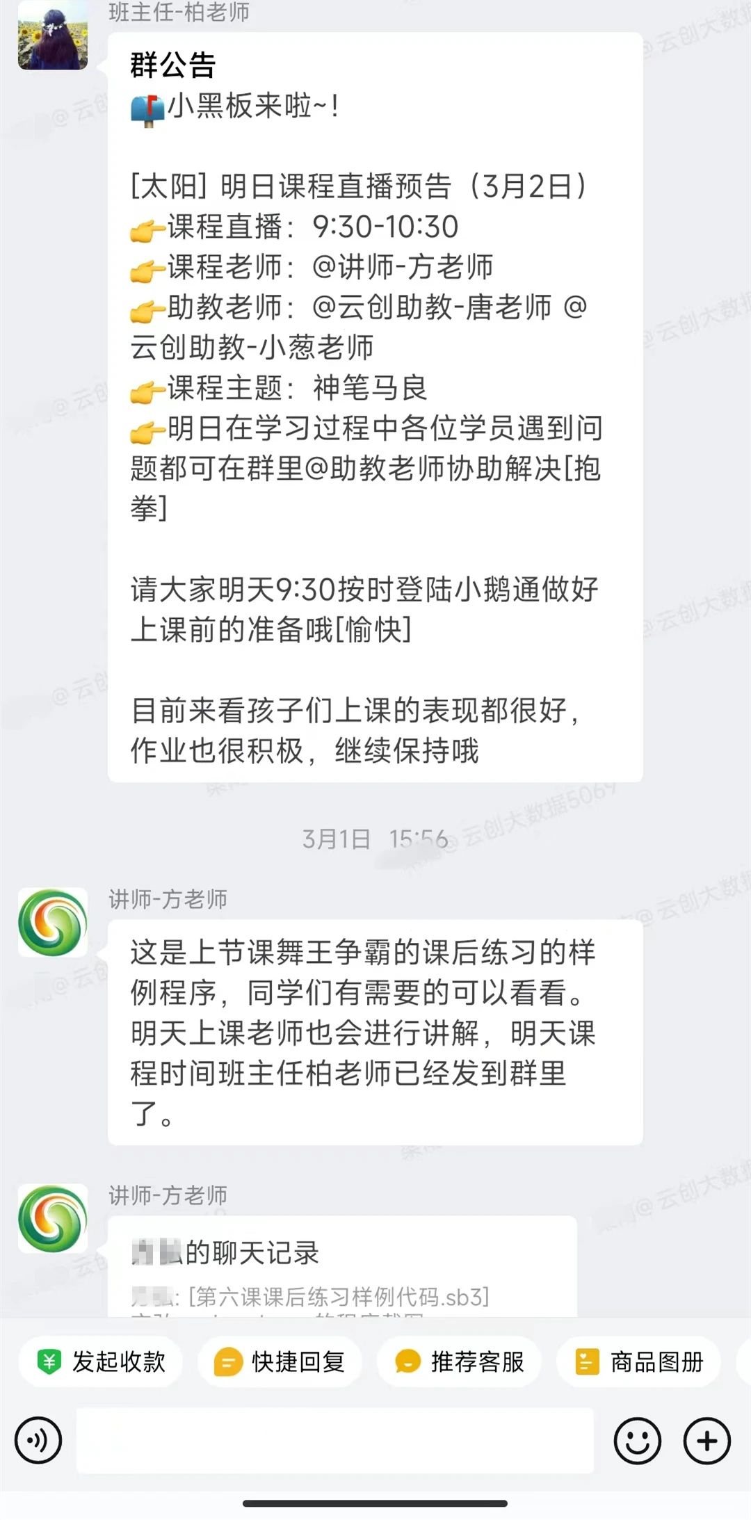 圖形化編程思維拓展課程亮點突出,采用直播授課+實驗實戰+在線答疑的方式,培養了小學員們對少兒編程的興趣,同時也強化了其綜合素養。在整個培訓期間,答疑服務貫穿始終,貼心而周到。