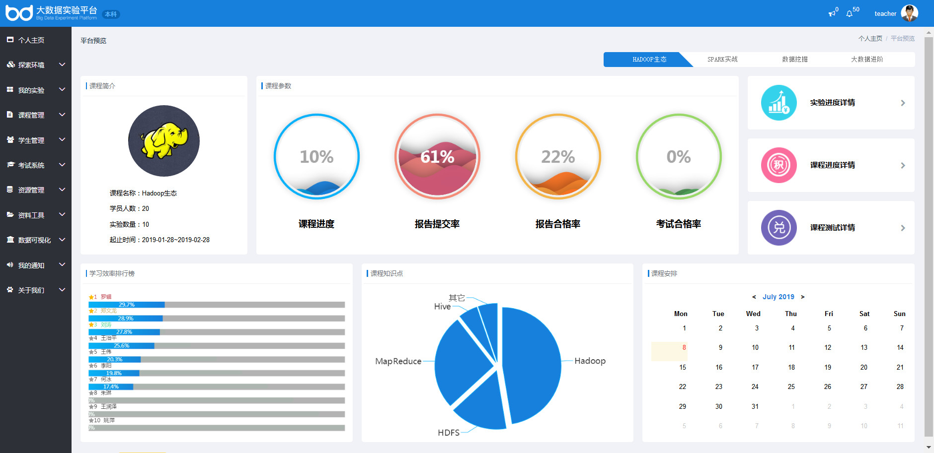 具體而言,云創(chuàng)大數據實驗室建設方案基于大數據實驗平臺(包括本科與高職兩大平臺,以及金融、電子商務、數學統計等多個版本)建設而成,以Docker容器技術,為用戶提供大數據實驗服務,可支持大量用戶同時在線實驗,且實驗環(huán)境彼此隔離、互不干擾,并同步提供實驗手冊、課程資源、教學視頻、考試系統等,以此幫助高校師生在平臺上輕松開展大數據教學與實驗。