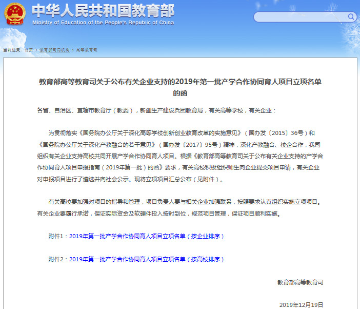 “產學合作協同育人項目”,由教育部為貫徹落實《國務院辦公廳關于深化高等學校創新創業教育改革的實施意見》和《國務院辦公廳關于深化產教融合的若干意見》精神,于2014年啟動實施,旨在以產業和技術發展的新需求推動高校人才培養改革,培養適應產業發展需要的應用型、復合型、創新型人才。