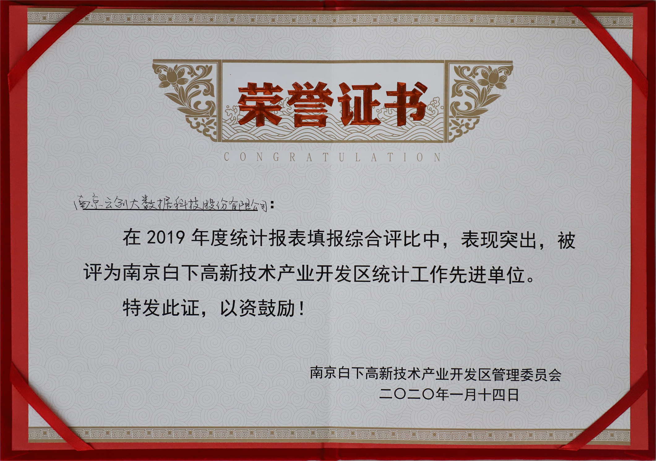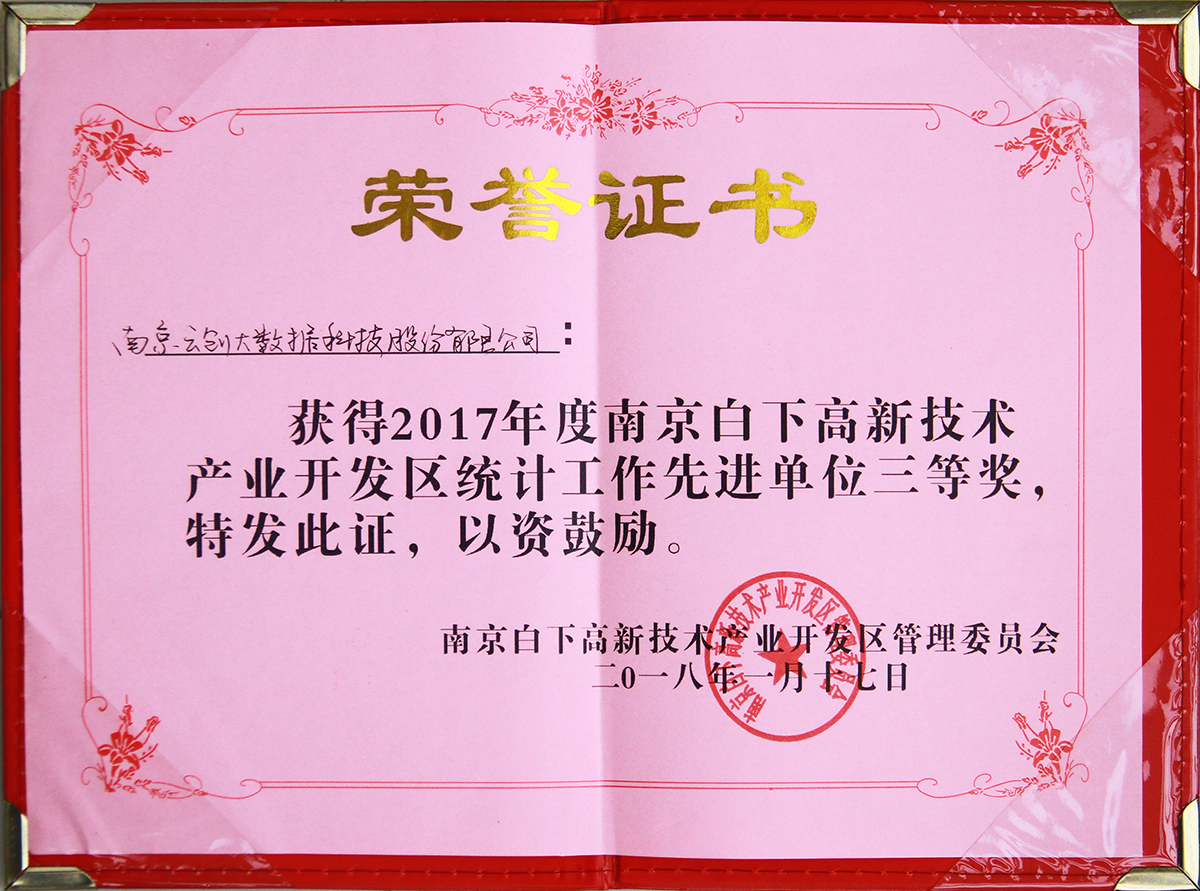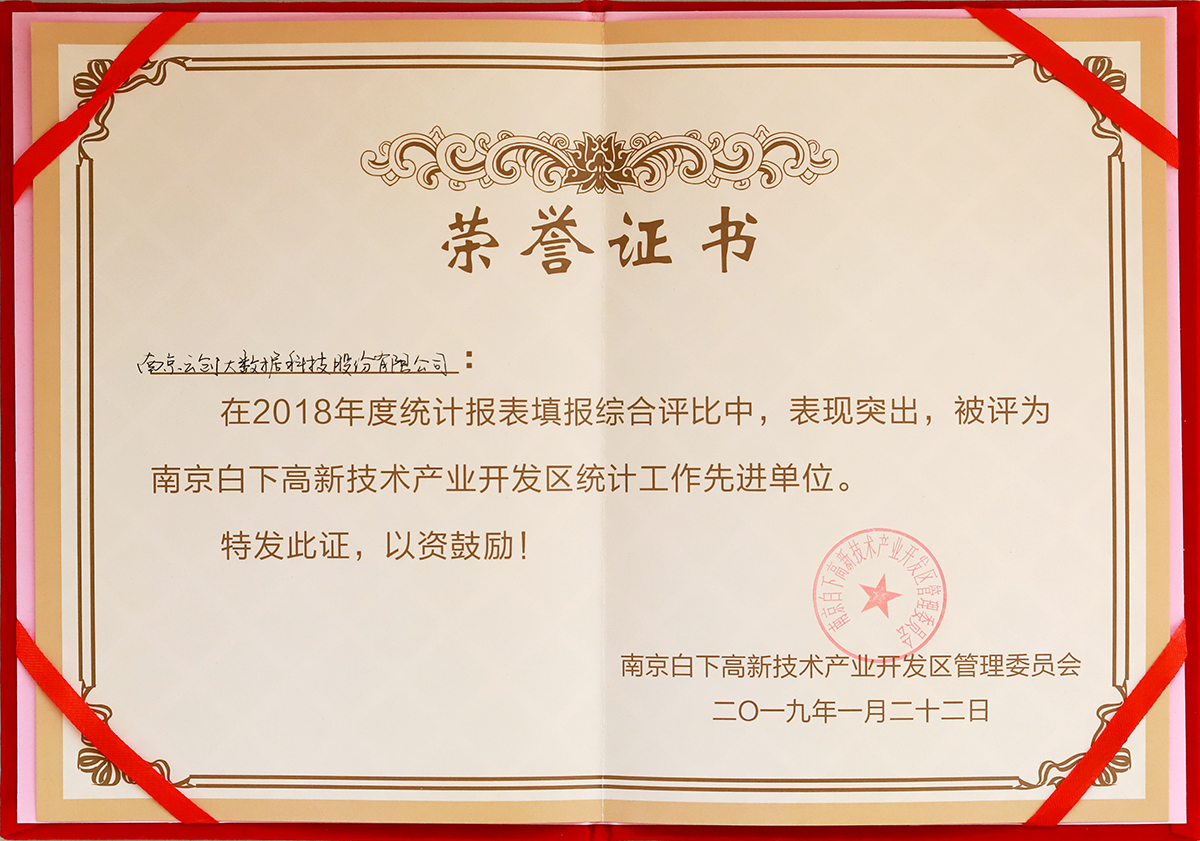 本次評比通過對開發區內企業填報的研究經費支出、研發機構數量、高企資質、研發人員數量、專利申請授權數目等數據以及企業報表上傳的及時性、配合度等多方面進行綜合評審。經過多方考量,云創大數據榮獲“2019年度南京白下高新技術產業開發區統計工作先進單位”,這也是云創繼2017、2018年度后再度摘得此次殊榮。至此,云創已經連續三年獲評“南京白下高新技術產業開發區統計工作先進單位”!