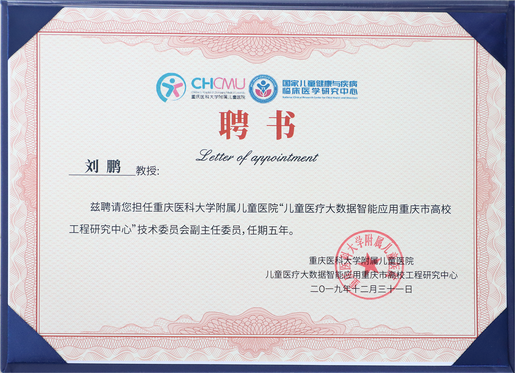 其中,清華大學博士、中國大數據應用聯盟人工智能專家委員會主任、南京大數據研究院院長、云創大數據總經理劉鵬教授被正式受聘為重慶醫科大學附屬兒童醫院“兒童醫療大數據智能應用重慶市高校工程研究中心”技術委員會副主任委員。