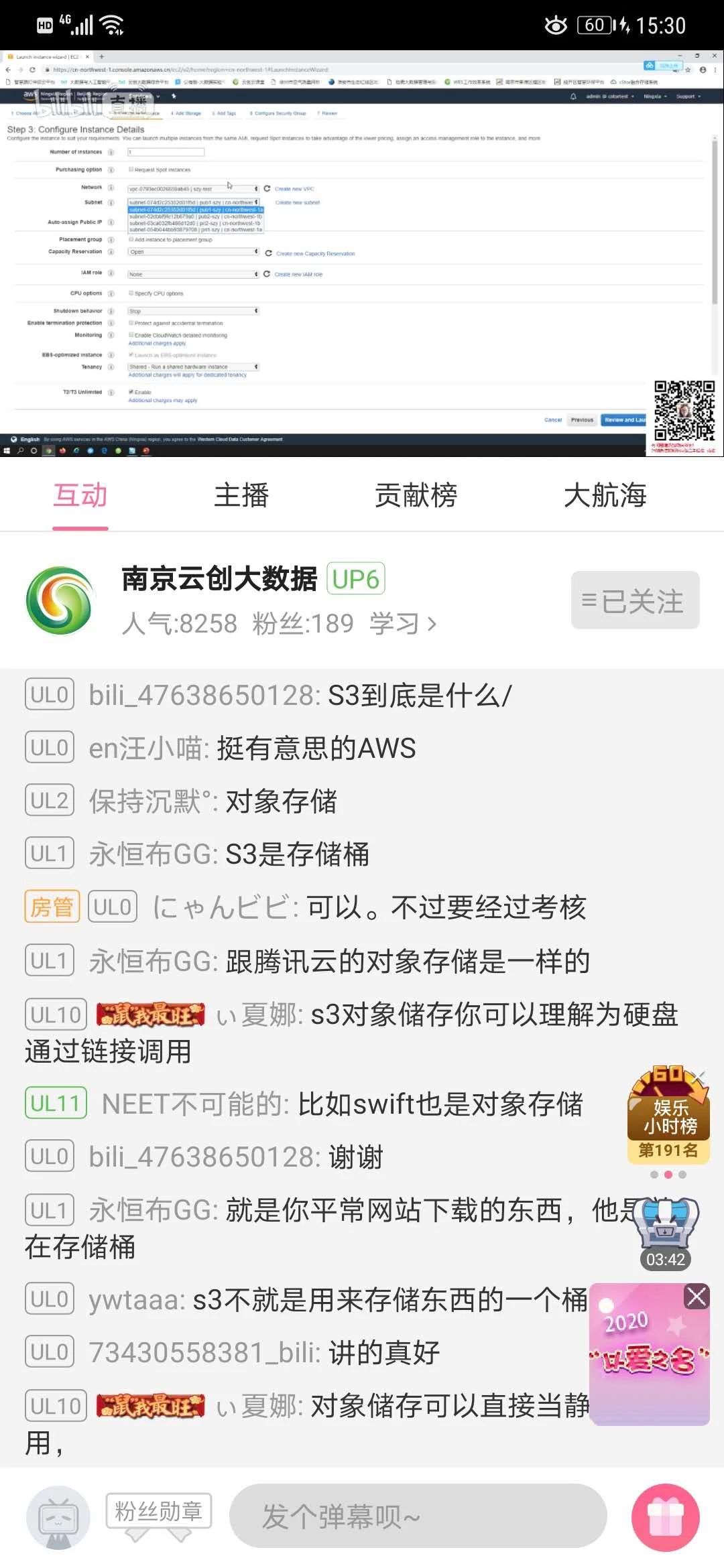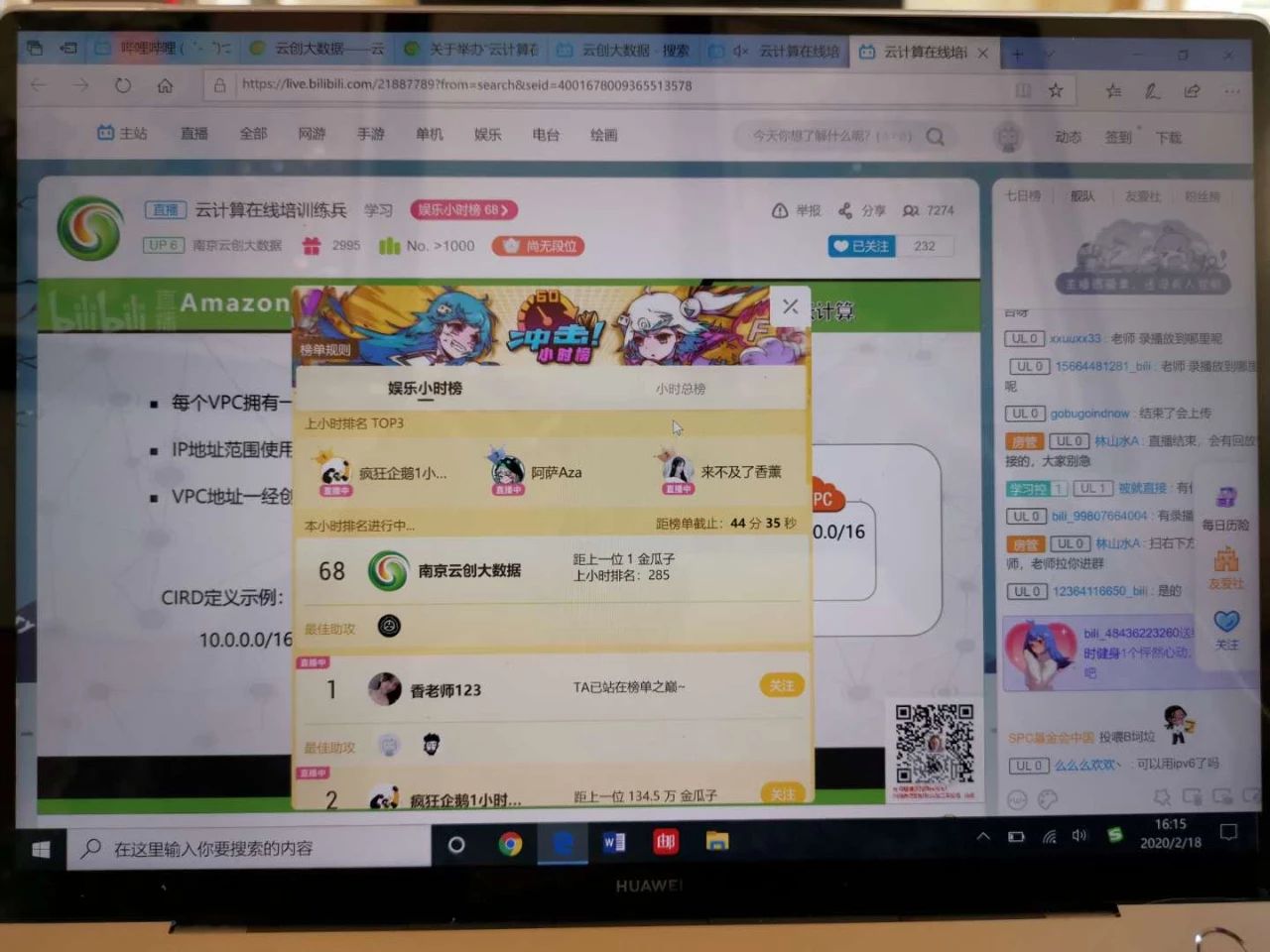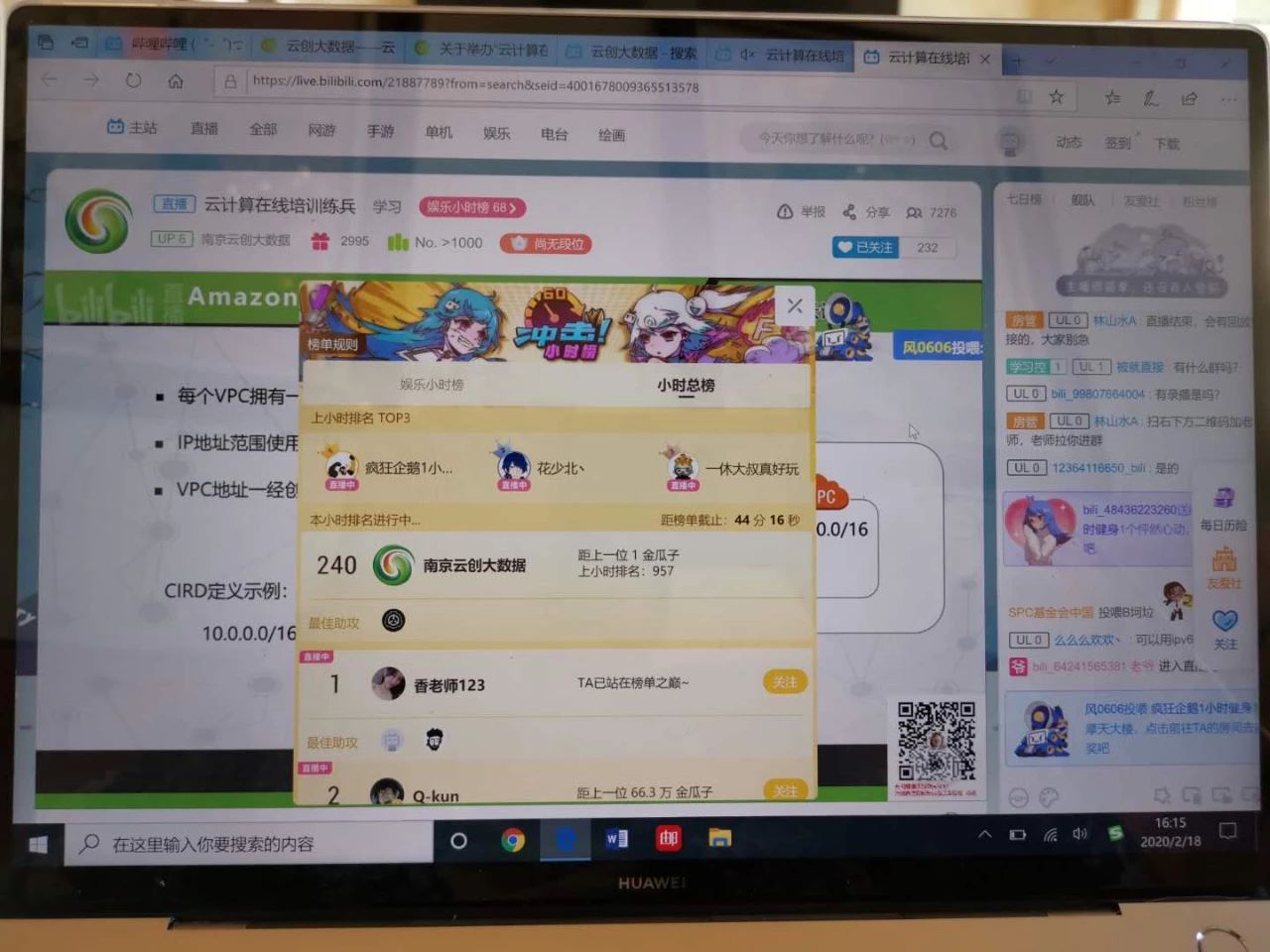 2月17日,由云創大數據主辦的“云計算在線培訓練兵”通知一經發出,即得到了熱烈響應,短短1天時間內3場練兵報名均已滿額。18日,在剛剛結束的“云計算技能在線培訓”中,在線直播同時在線人數超過8000人, 達到了嗶哩嗶哩小時總榜的240名和娛樂小時榜的68名。