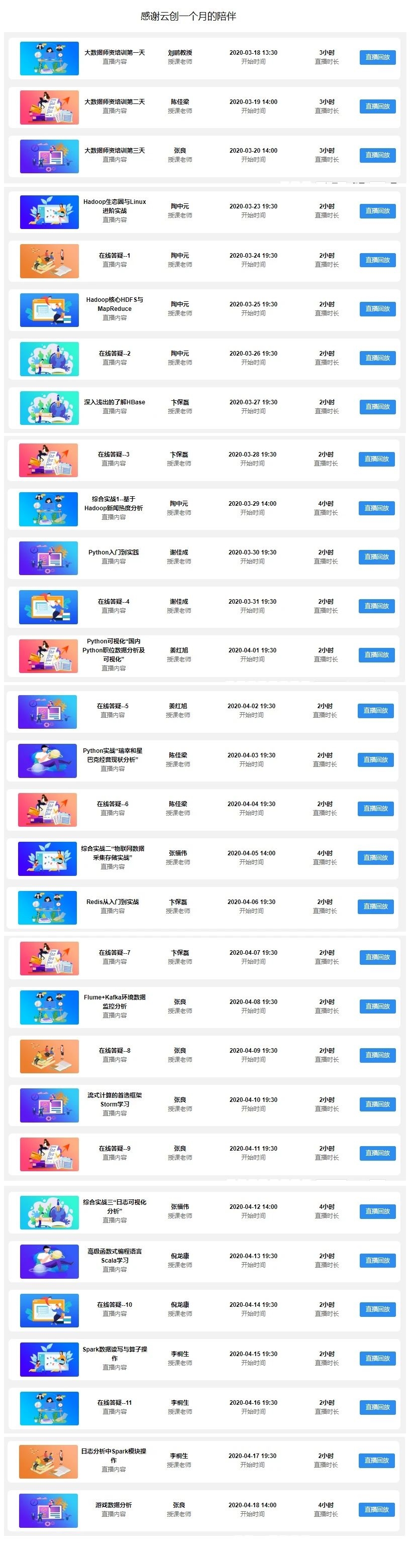 本期培訓班課程安排系統(tǒng)科學,在優(yōu)秀講師團隊的講解下,學員們學習了十五節(jié)課程,包括十一節(jié)大數(shù)據(jù)基本課程講解和“基于Hadoop新聞熱度分析”、“物聯(lián)網(wǎng)數(shù)據(jù)采集存儲實戰(zhàn)”、“日志可視化分析”以及“基于公共基因庫分析探討新冠病毒起源”四節(jié)綜合實戰(zhàn)。參訓學習學習熱情高漲,大家將實驗逐一跑通,不少學員反饋跑通實驗的感覺很是美妙。