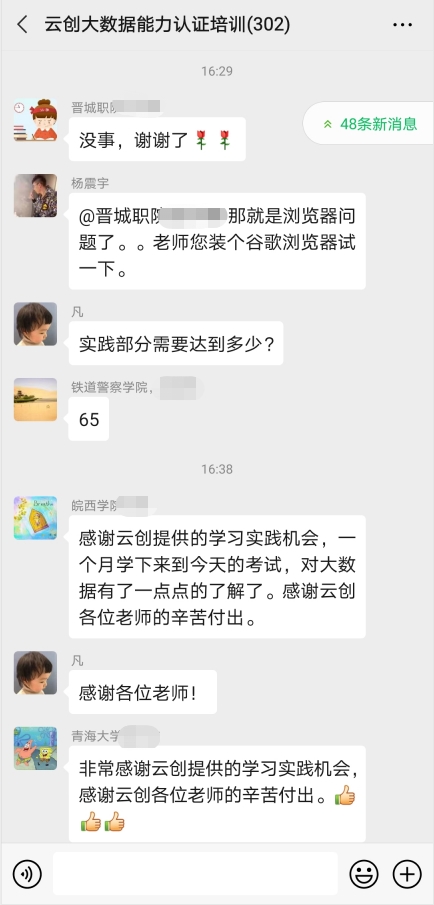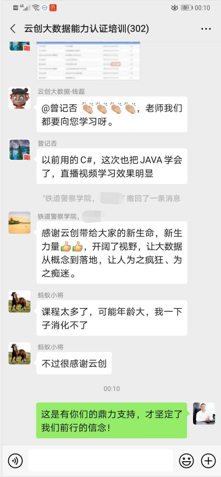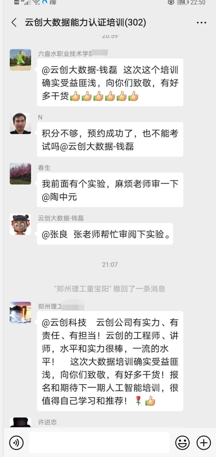 培訓結(jié)束后,參訓學員紛紛反饋課程干貨很多,自己受益匪淺,給他們從事大數(shù)據(jù)教學以及人才培養(yǎng)帶去了很多啟發(fā)。同時,云創(chuàng)大數(shù)據(jù)的實力和擔當也收獲大家的不俗評價。此外,對于能夠提供這樣一個難得機會的劉鵬教授和云創(chuàng)大數(shù)據(jù),學員們也表示非常感謝,并對講師團隊的悉心指導給予了高度好評!值得一提的是,更有學員對云創(chuàng)將要舉辦的人工智能能力認證(中級)培訓充滿期待。