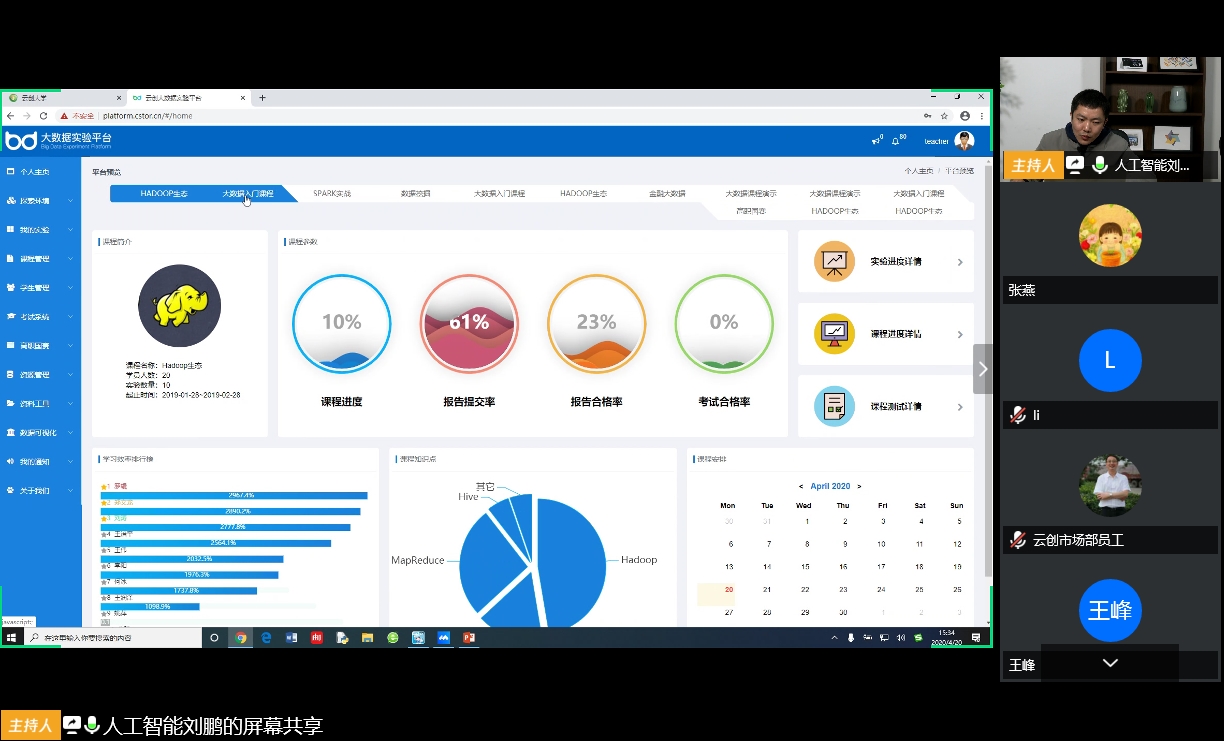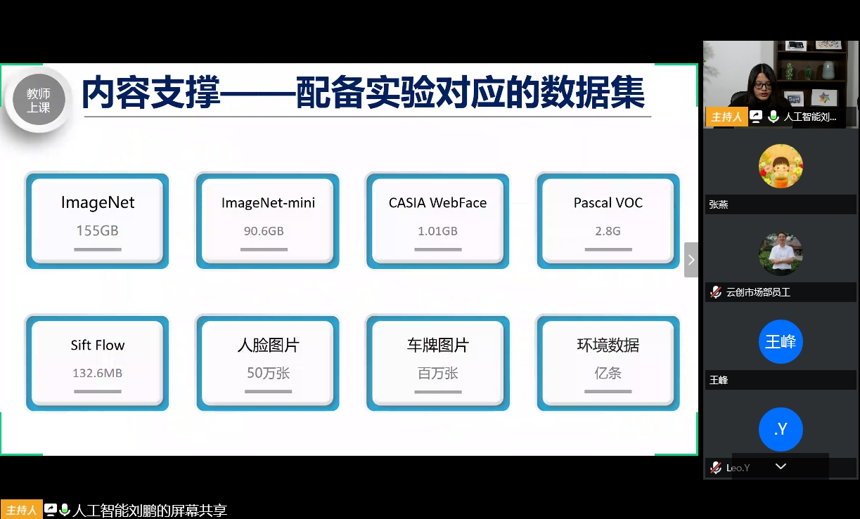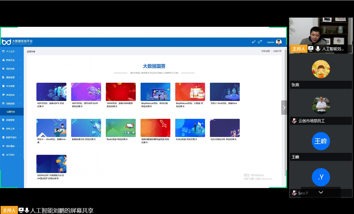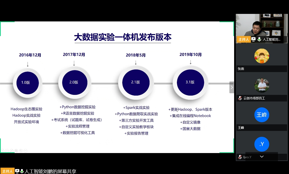 最后,針對此前劉鵬教授介紹的云創學習工場平臺,楊震宇經理進行了細致的講解與演示,包括平臺課程、積分、云點等,并通過具體課程內容梳理和導學視頻,使在線合作伙伴對云創學習工場平臺建立了更為直觀系統的認識,相信通過云創學習工場平臺體系的系統訓練,可向社會輸出更多高水平的大數據與人工智能人才。