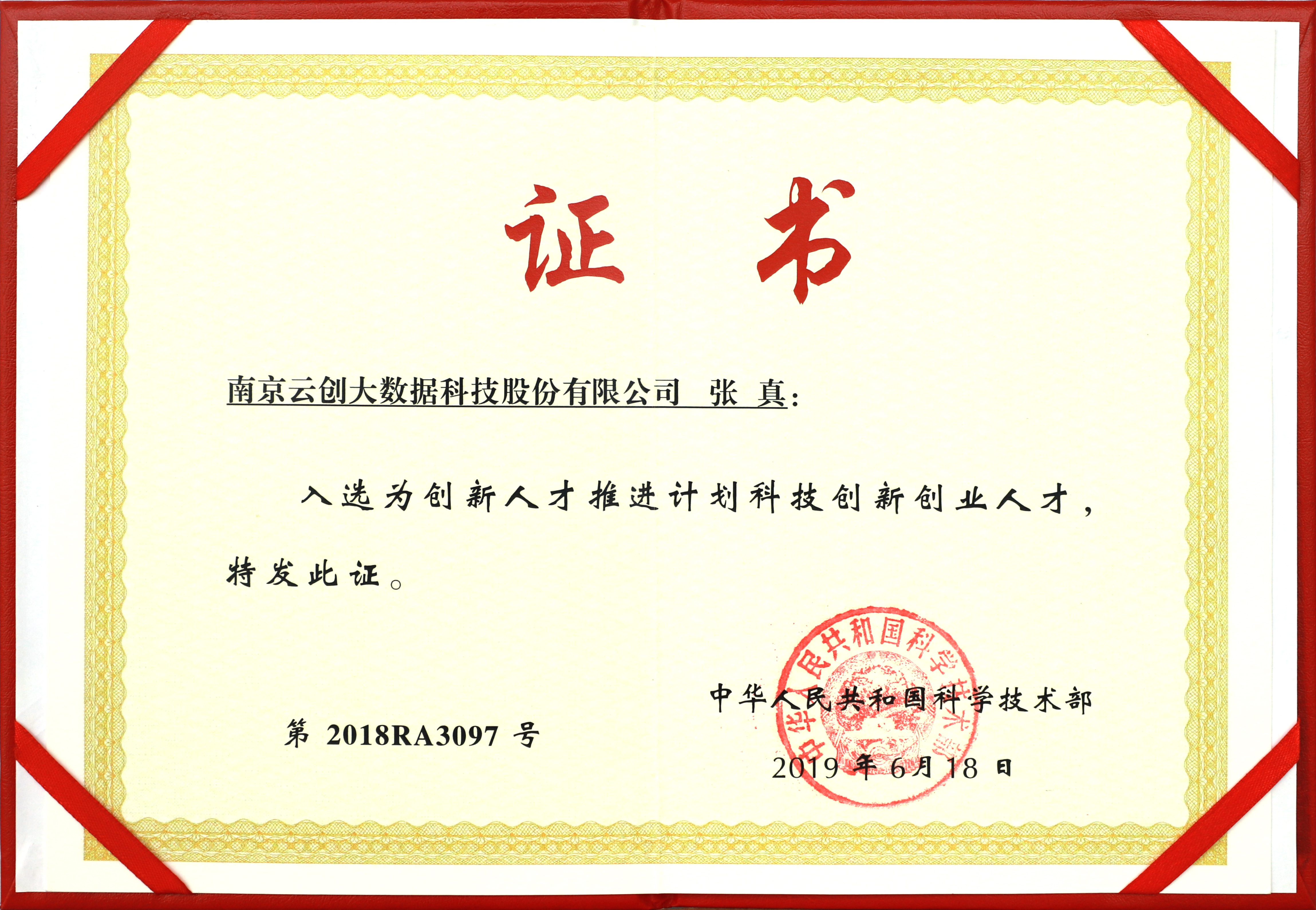 近日,經申報推薦、形式審查和專家評議等環節,云創大數據張真董事長入選為“創新人才推進計劃科技創新創業人才”,并獲得科技部授予的創新人才推進計劃證書。