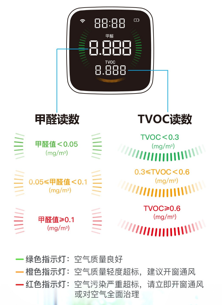 單次檢測受制于外界環(huán)境的影響,數據難免不準。環(huán)境貓可實現(xiàn)24小時實時檢測,并通過綠、橙、紅三種指示燈表示優(yōu)、良、差等級,讓人一目了然,隨時確定何時搬入新居,何時通風,何時開凈化器等,呵護身心健康。