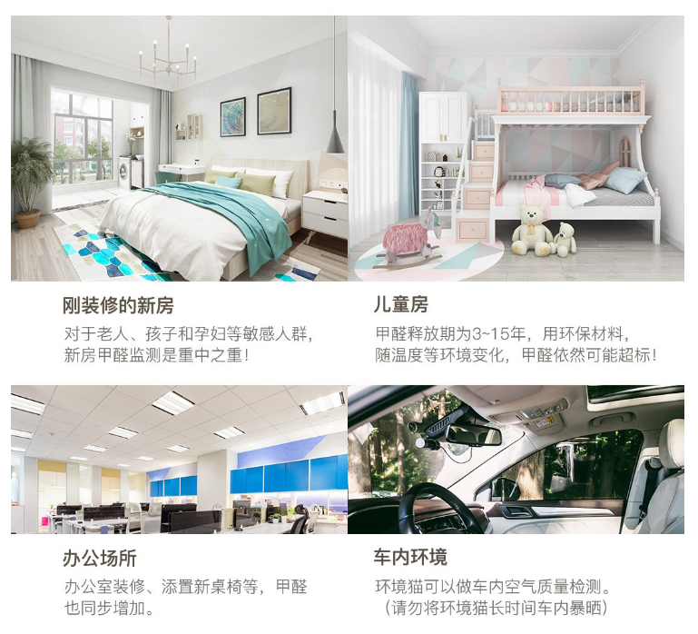 環(huán)境貓可適用于多種場合,特別適用于剛裝修的新房、兒童房、酒店、辦公場所,以及車內環(huán)境等,滿足多場合檢測需求。