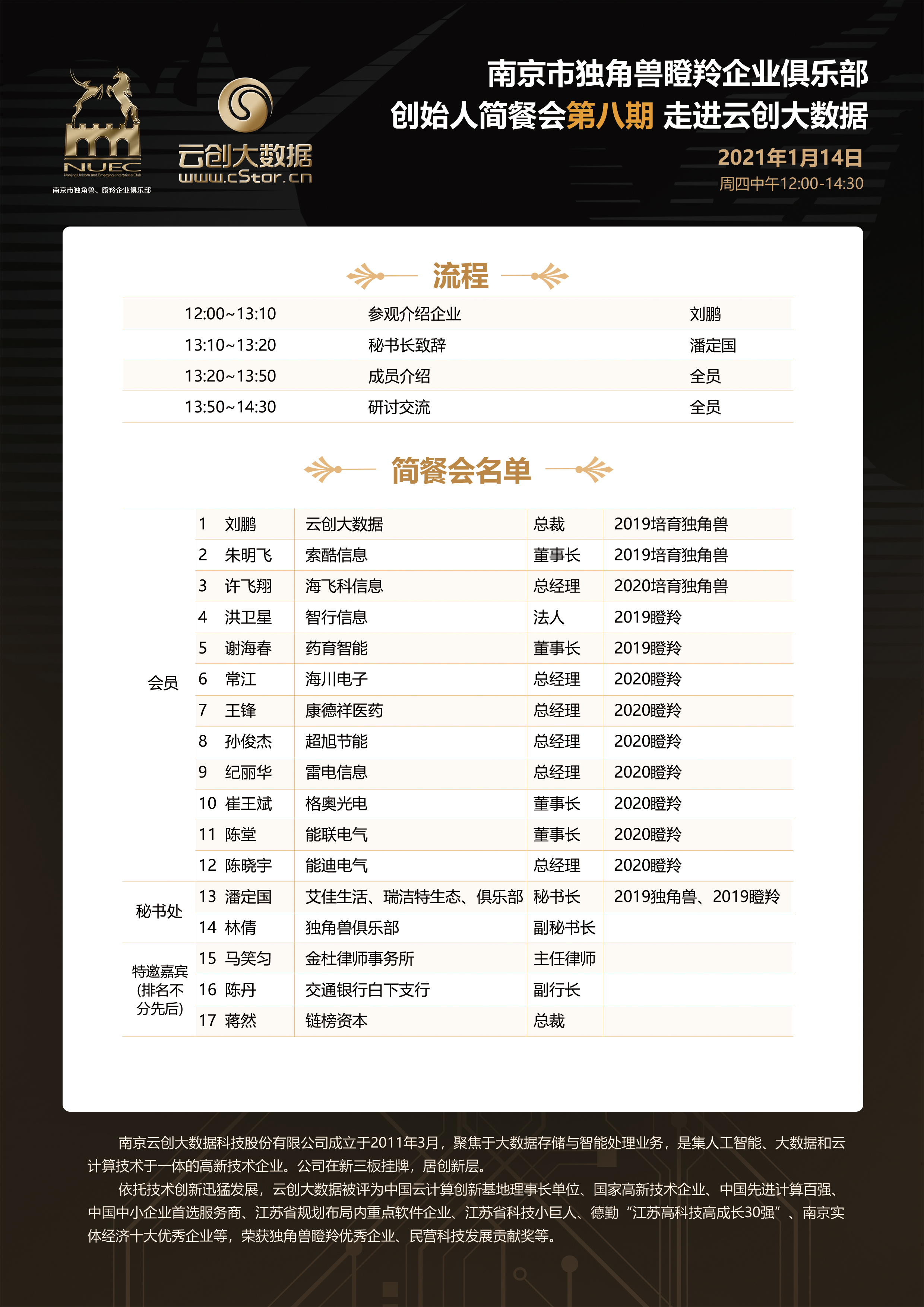 1月14日,“南京市獨角獸瞪羚企業俱樂部創始人簡餐會第八期”走進云創,總裁劉鵬教授和外聯負責人沈大為等共同接待了來賓。本次到訪的來賓共十多位,大多是南京市獨角獸和瞪羚企業的董事長、總裁、總經理。