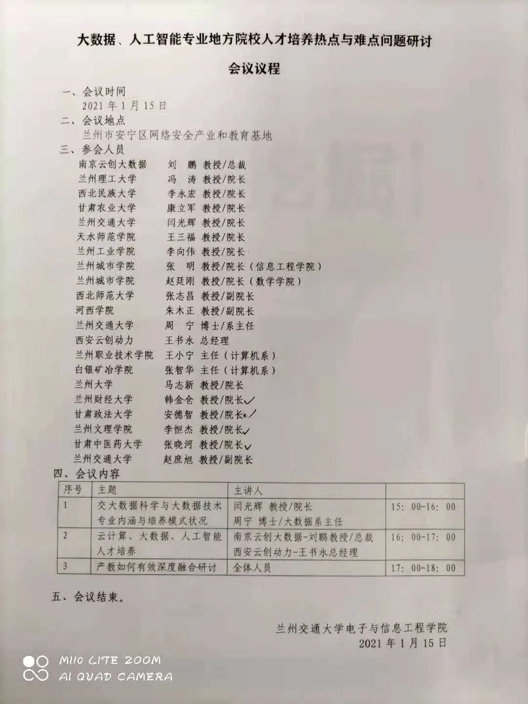 1月15日下午,大數據、人工智能專業地方院校人才培養熱點與難點問題研討會在蘭州市安寧區網絡安全產業和教育基地舉辦。本次活動由蘭州交通大學電子與信息工程學院主辦,南京云創大數據科技股份有限公司與西安云創動力信息科技有限公司協辦。