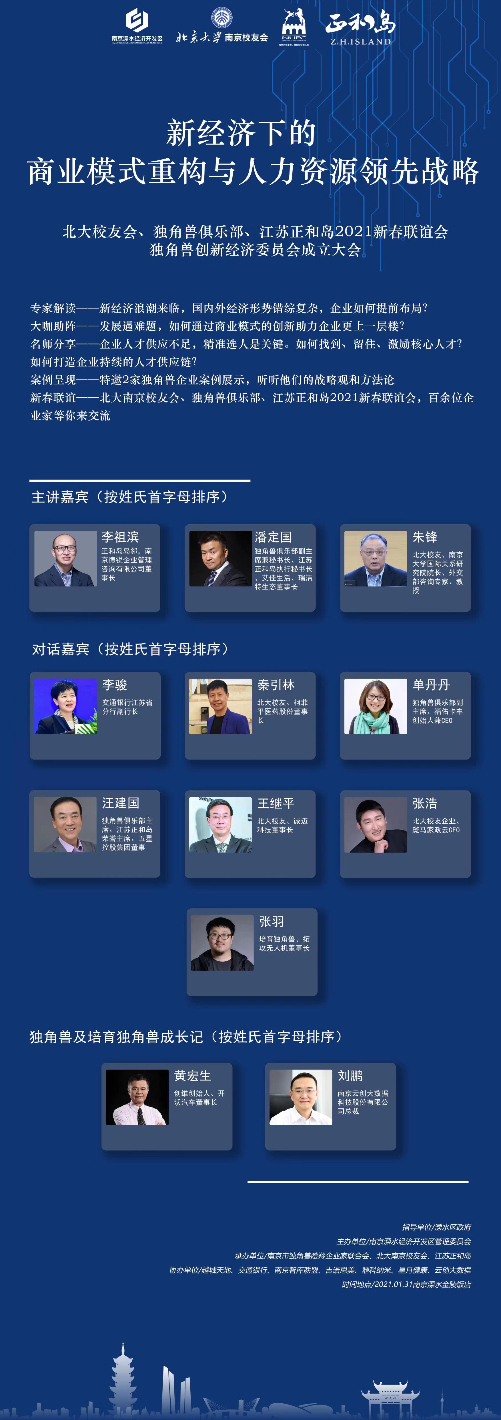 本次活動得到了溧水區政府的指導,由南京溧水經濟開發區管理委員會主辦,南京市獨角獸瞪羚企業家聯合會、北大南京校友會、江蘇正和島承辦,云創大數據、越城天地、交通銀行、南京智庫聯盟、吉諾思美、鼎科納米、星月健康協辦。