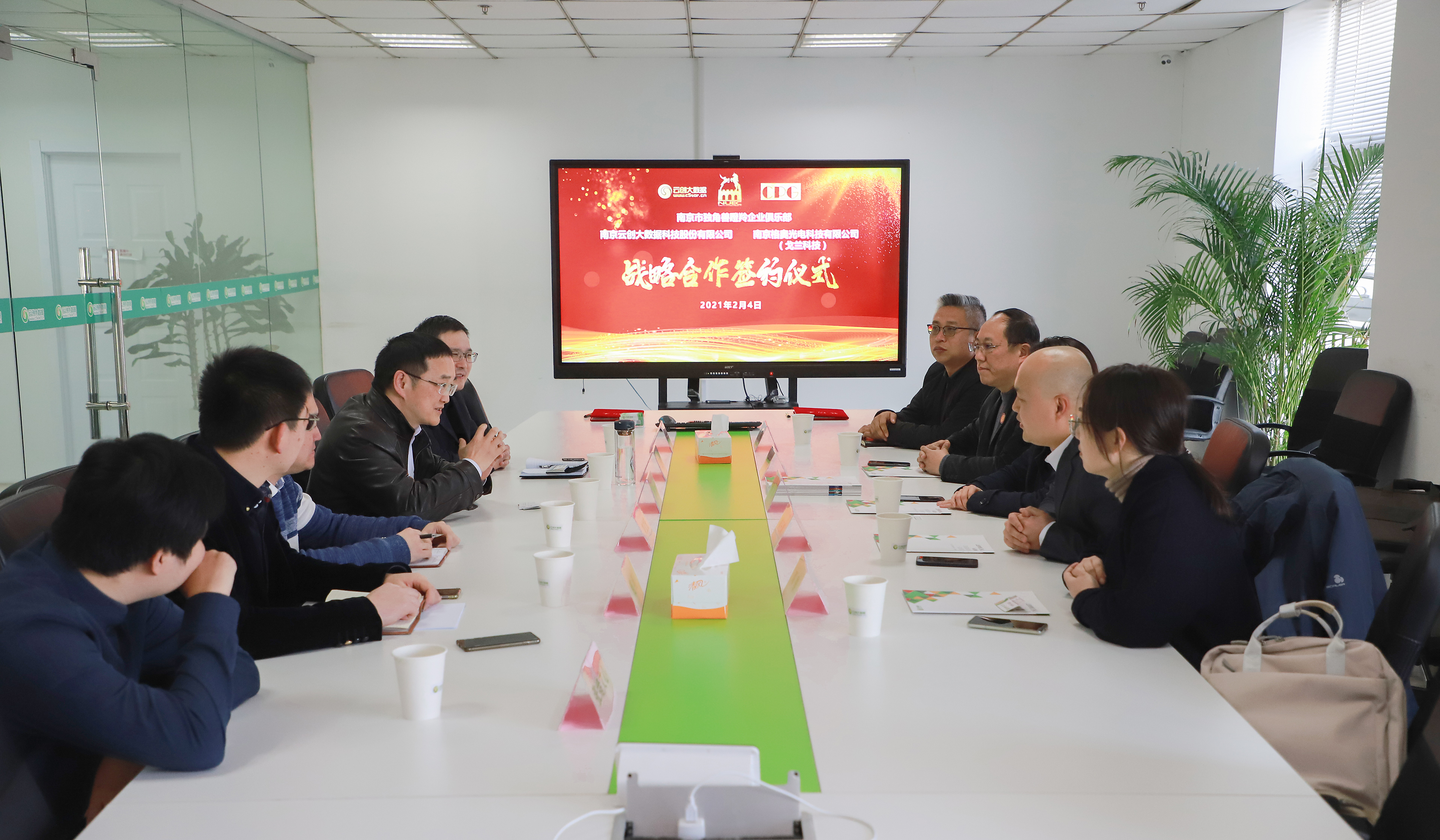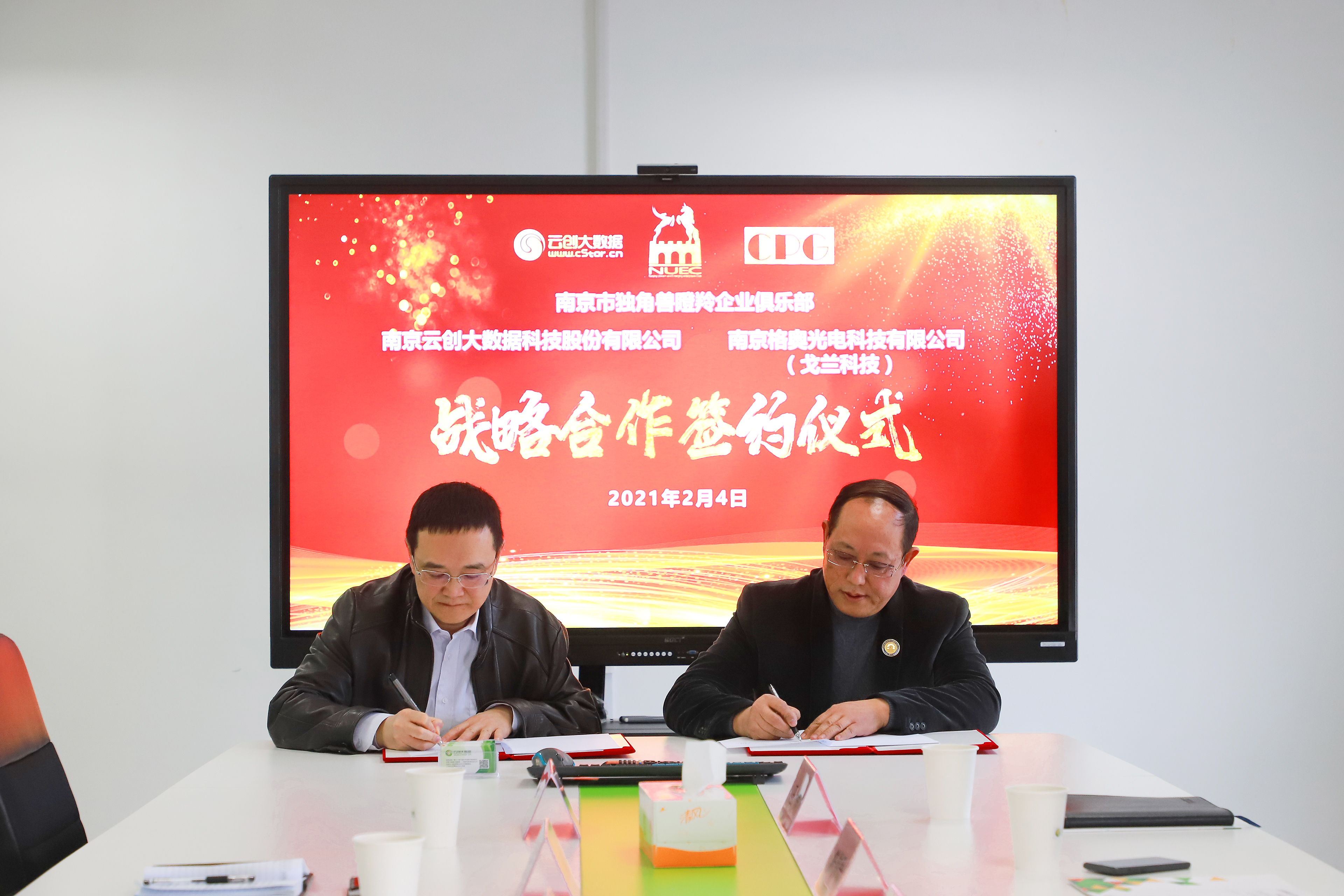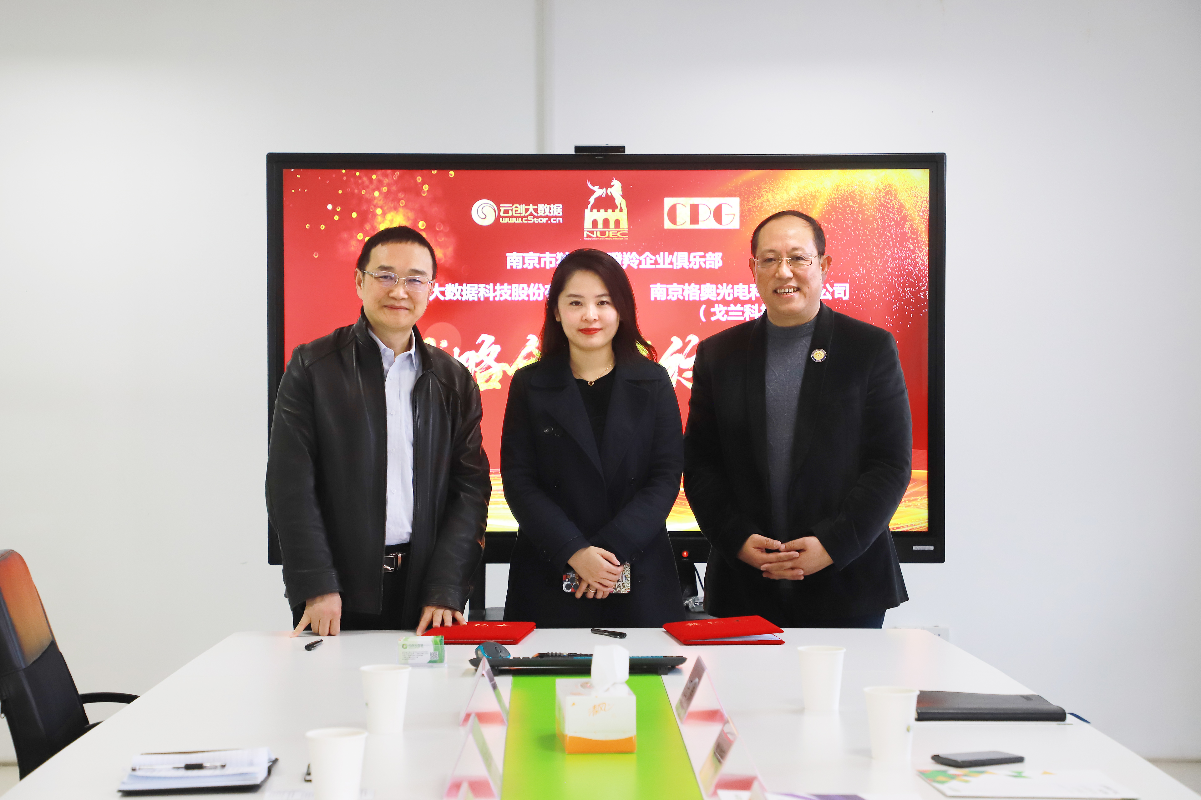 2月4日,在南京市獨角獸瞪羚企業俱樂部秘書處副秘書長林倩的見證下,南京云創大數據科技股份有限公司與南京格奧光電科技有限公司(戈蘭科技)正式簽訂戰略合作協議。格奧光電董事長陳偉民、總經理崔王斌、副總經理王偉、鄧黎,云創大數據總裁劉鵬教授、劉立宏總監、范濤總監等共同出席了簽約儀式。