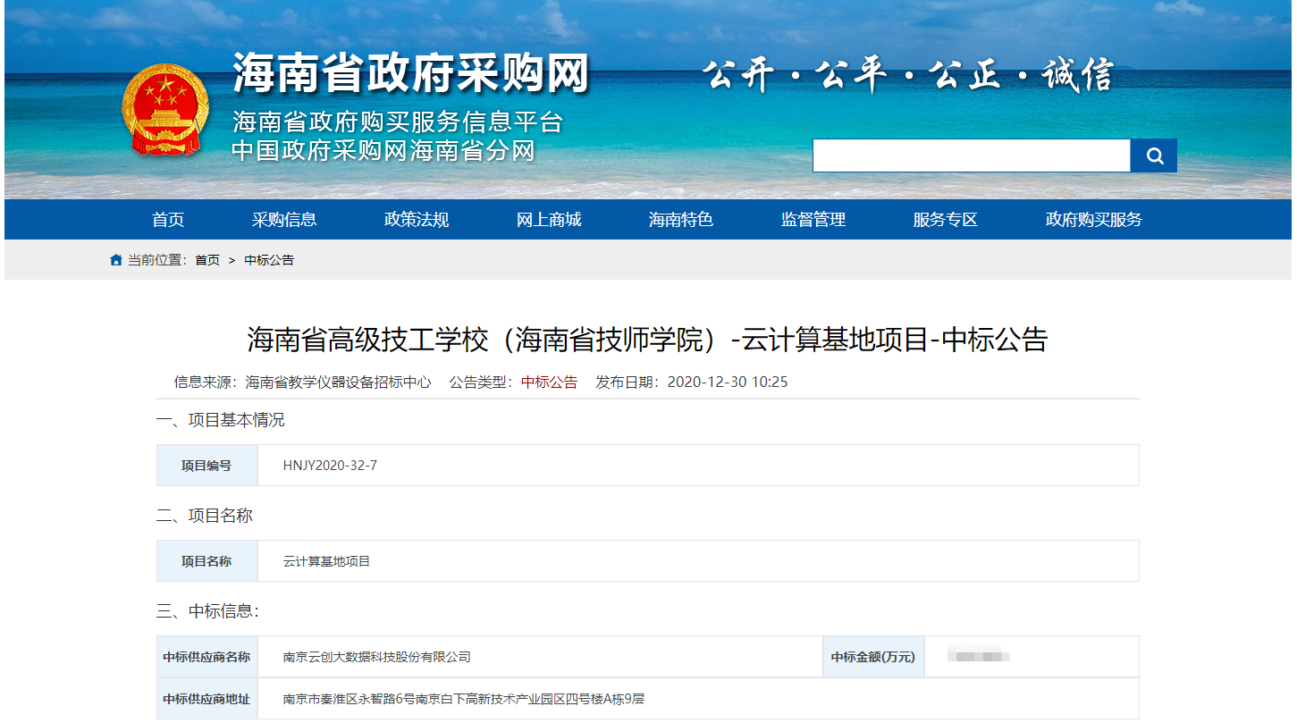 百年大計(jì),教育為本。近日,海南省政府采購(gòu)網(wǎng)公布(信息來源:海南省教學(xué)儀器設(shè)備招標(biāo)中心)公告,在教育培訓(xùn)領(lǐng)域具有不俗技術(shù)實(shí)力和眾多案例積累的云創(chuàng)大數(shù)據(jù)憑借云計(jì)算實(shí)訓(xùn)平臺(tái)成功中標(biāo)海南省高級(jí)技工學(xué)校(海南省技師學(xué)院)云計(jì)算基地項(xiàng)目。