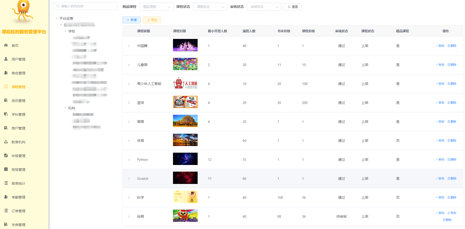 通過云創課后延時管理服務平臺,各中小學??梢詥为毣蚵摵舷嚓P機構開課。學校可以借助課程管理、年級管理、班級管理等功能模塊,為不同年級與班級選擇藝術、科技等不同的特色興趣課程。學校教師可通過平臺開展教務管理,對學生的學習效果與出勤情況等也能做到了然于心。相關機構也可以查看其開設課程的相關情況。
