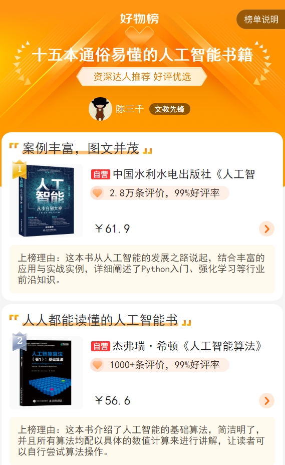 京東好物榜是基于京東商品大數據和達人推薦結合的品類榜單,達人依據領域專業度,甄選店鋪評分好、商品好評率高的好物上榜,以提供具有指導意義的消費指南,有效幫助購買決策。《人工智能——從小白到大神》被京東好物榜置頂推薦,即讀者對該書的充分認可與肯定。