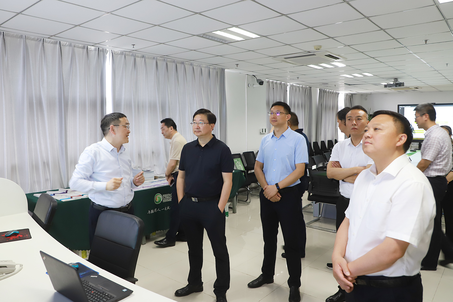 在中國云計算創新基地9層,大家分別參觀了榮譽資質和技術專利展區、劉鵬教授主編圖書展區,以及大數據運營中心。看到擺放整齊、琳瑯滿目的各項殊榮,大家給予了高度贊賞。大數據運營中心展示的燃氣報警云平臺、地震數據管理與服務平臺、云創學習工場平臺等產品應用酷炫的設計、特色的功能和貼心的服務給大家留下了深刻印象。方忠書記還就感興趣的話題與劉鵬教授進行了交流和探討。