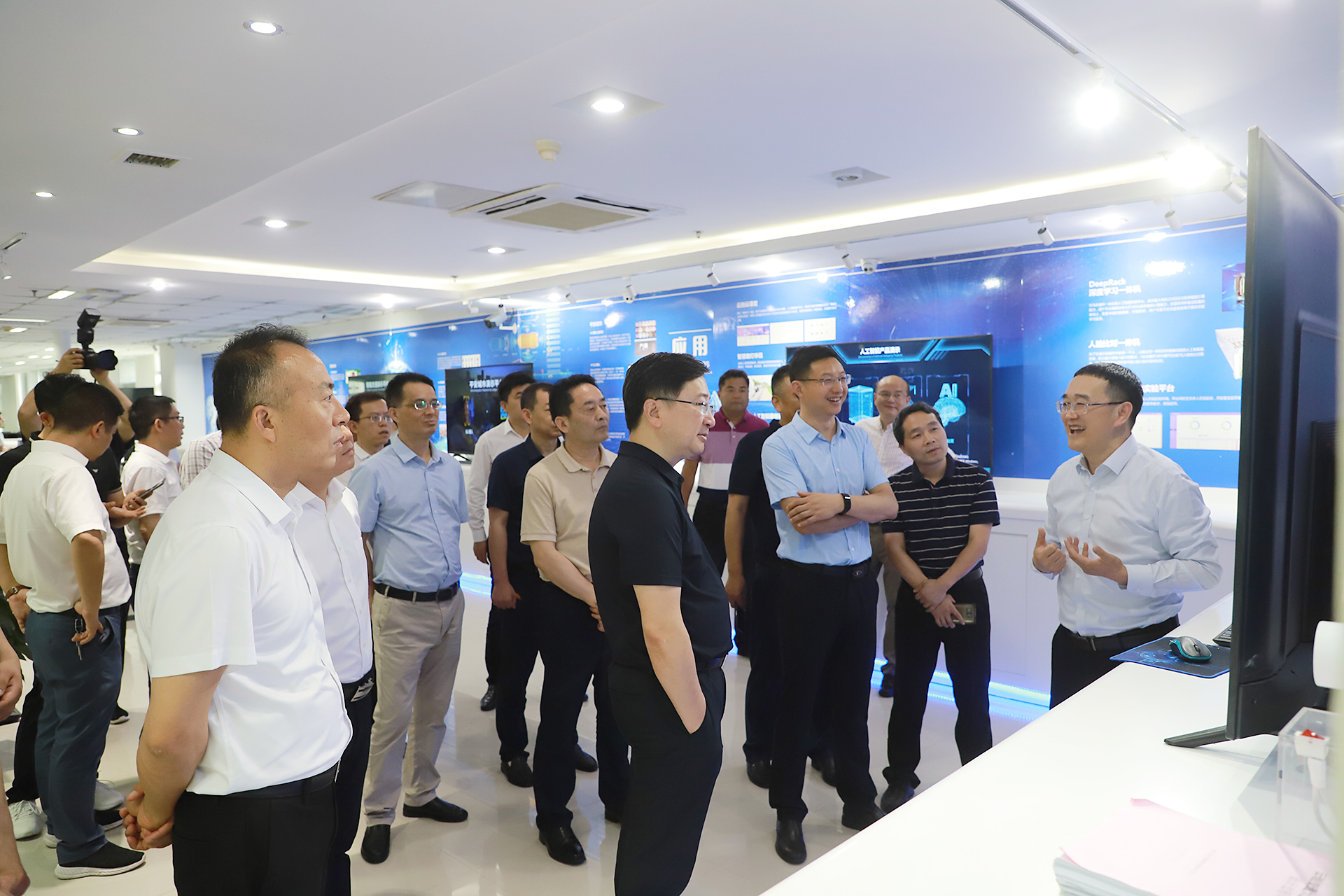 移步中國云計算創新基地10層后,大家對云創人工智能研究院進行了實地參觀。云創在行業深耕、持續創新的研發實力和不俗成績吸引了大家的駐足了解。劉鵬教授和沈大為給大家做產品案例介紹,并請技術工程師演示了多個產品應用。云創掌握的模糊人臉識別技術、城市交通智能優化技術,開發的智慧路燈伴侶,以及與鐘南山院士團隊合作進行新冠肺炎疫情預測等收獲大家不俗贊賞。
