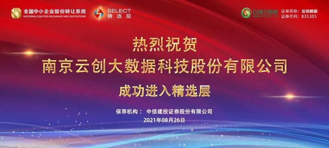 8月26日,南京云創大數據科技股份有限公司(股票簡稱:云創數據,股票代碼:835305,公司簡稱:云創大數據)成功進入全國股轉系統精選層掛牌。這是云創大數據繼2015年掛牌新三板,2020年進入創新層以來的又一里程碑事件。云創大數據也成為南京第一家精選層掛牌公司。