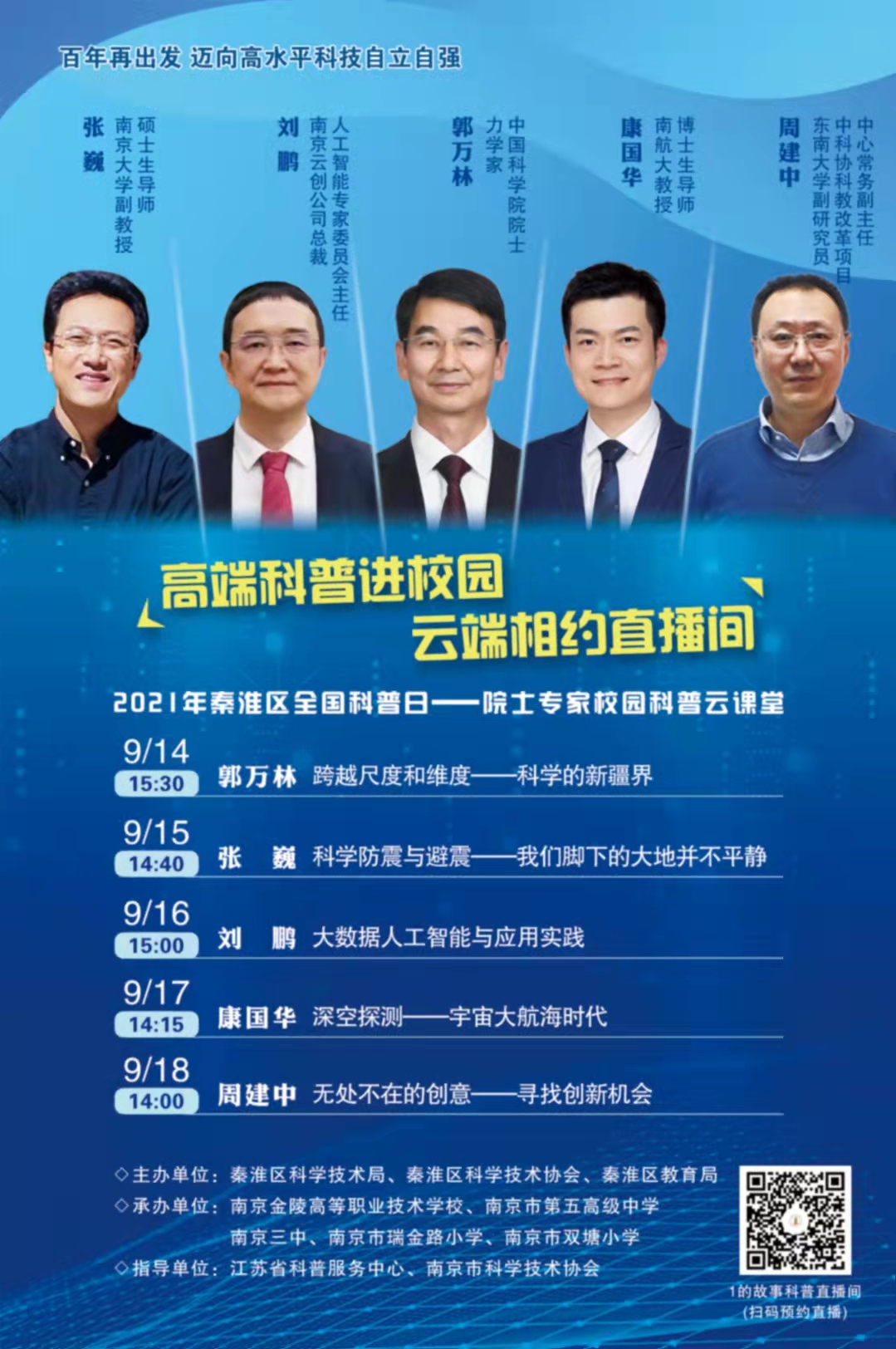 9月14日-18日,2021年秦淮區(qū)全國科普日——院士專家校園科普云課堂系列活動將連續(xù)舉辦5場。活動在江蘇省科普服務(wù)中心、南京市科學(xué)技術(shù)協(xié)會指導(dǎo)下,由秦淮區(qū)科學(xué)技術(shù)局、區(qū)科學(xué)技術(shù)協(xié)會、區(qū)教育局主辦。活動旨在向公眾分享科學(xué)家精神,幫助青少年領(lǐng)會科技魅力,在實踐中體驗科技知識,真正實現(xiàn)各項科普活動惠及于民、方便于民,真正讓大眾走進(jìn)科學(xué)、體驗科學(xué)、愛上科學(xué)。
