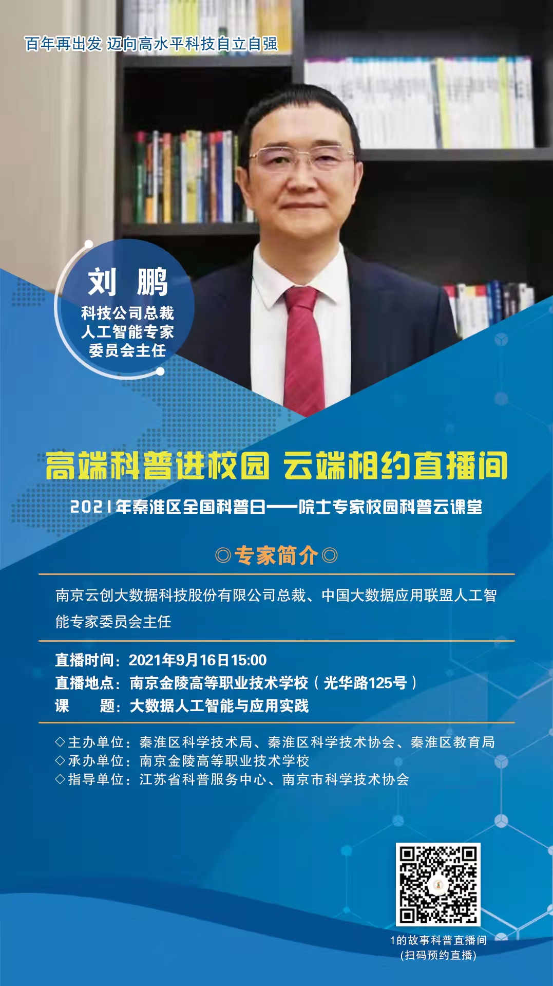 9月16日下午3點,以“高端科普進(jìn)校園 云端相約直播間”為主題的2021年秦淮區(qū)全國科普日——院士專家校園科普第三場云課堂如期開課。劉鵬教授為大家?guī)砹恕按髷?shù)據(jù)人工智能與應(yīng)用實踐”主題報告。