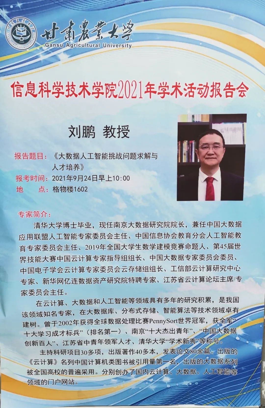 9月24日上午,劉鵬教授受邀在甘肅農(nóng)業(yè)大學信息科學技術(shù)學院2021年學術(shù)活動報告會作主題為《大數(shù)據(jù)人工智能應用實踐與人才培養(yǎng)》的報告。康立軍院長與一眾師生參加了本次報告會。