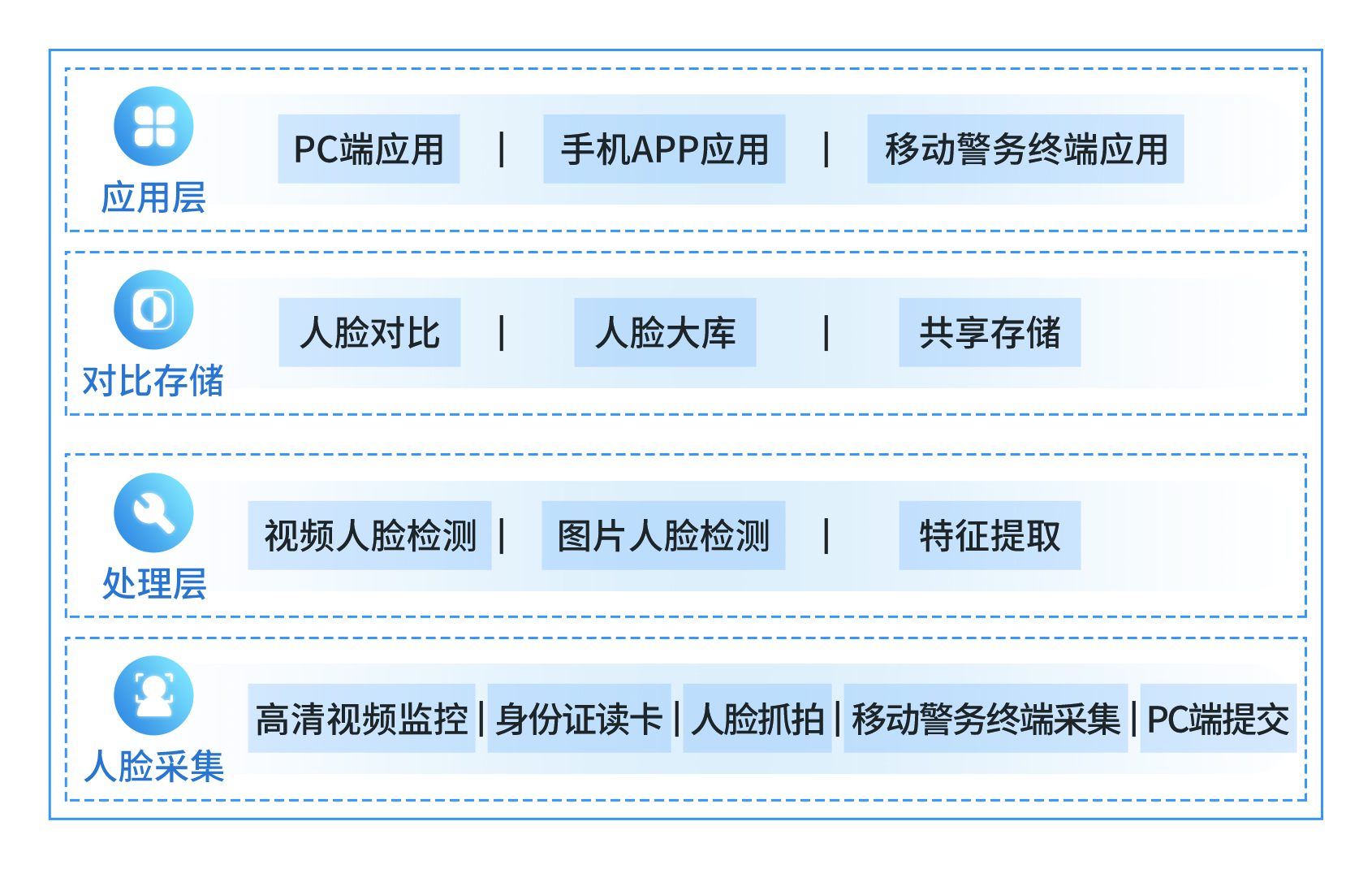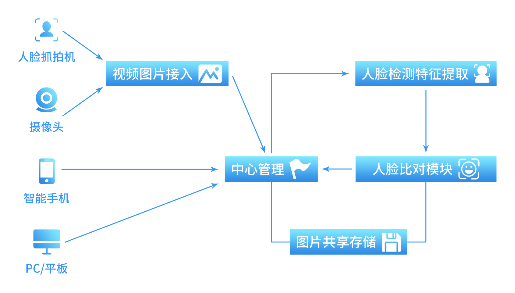 在支持傳統(tǒng)人證比對的基礎(chǔ)上,針對監(jiān)控攝像機、移動終端抓拍、視圖庫系統(tǒng)等眾多不同制式的前端設(shè)備,實現(xiàn)過往人員的非接觸式捕捉、識別與監(jiān)控。該系統(tǒng)具有高識別率、高可靠性、易于擴展、強兼容性等優(yōu)勢,將成為保護人民財產(chǎn)安全、強化社會治安、維護社會穩(wěn)定的又一科技利劍,在提升公共安全應(yīng)用科技含量和業(yè)務(wù)處理效率的同時,產(chǎn)生可觀的經(jīng)濟價值和社會價值。