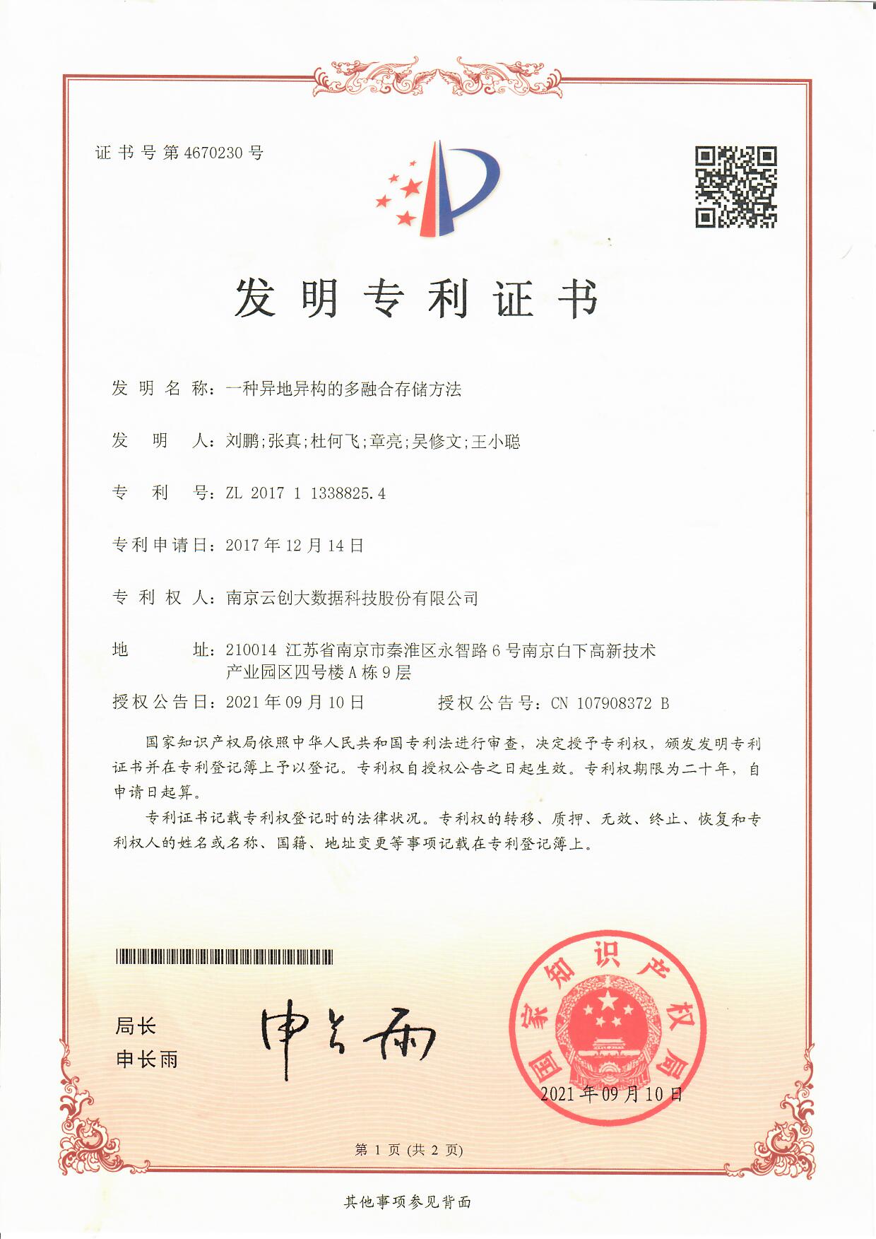 近日,南京云創大數據科技股份有限公司(簡稱“云創大數據”)在云存儲領域的研發成果再獲國家發明專利。其申請的“一種異地異構的多融合存儲方法”獲得了國家知識產權局頒發的發明專利證書。這體現了云創取得的獨立知識產權成果再次得到權威的認可和肯定。